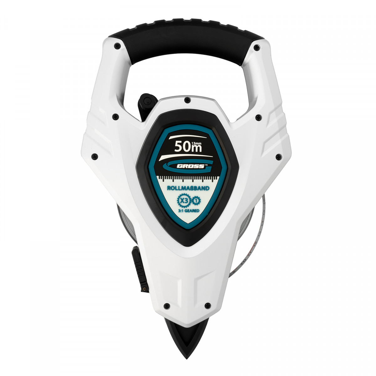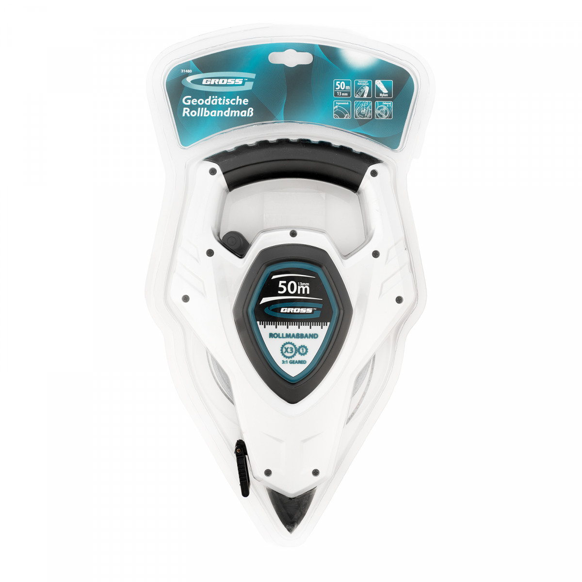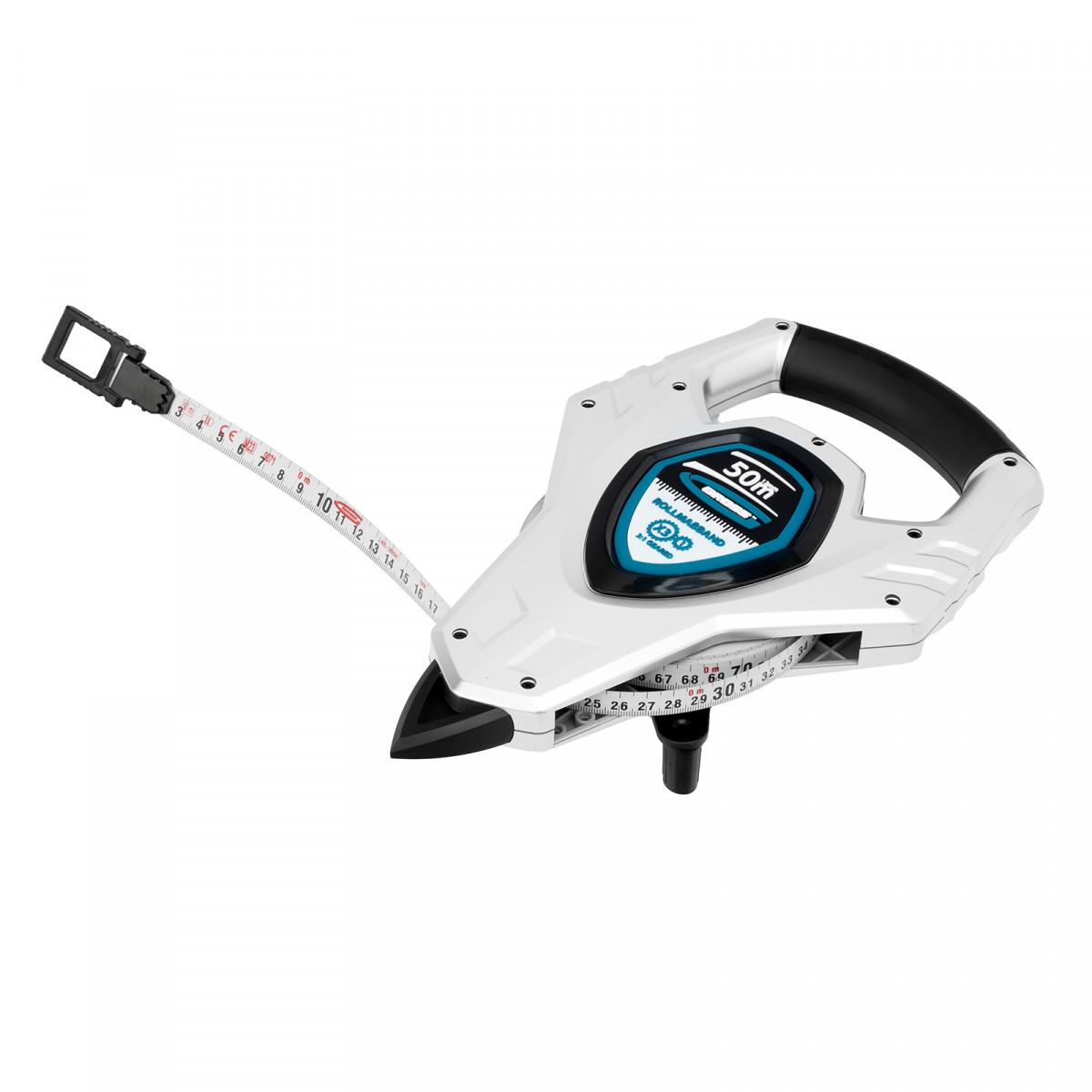 Геодезическая рулетка Gross 31480 в открытом корпусе, с металлической лентой длиной 50 м и шириной 13 мм, с нейлоновым покрытием, предназначена для проведения измерительных работ на строительных площадках и земельных участках большой площади. Стальная лента повышенной жесткости облегчает выполнение длинномерных измерений. Инструмент можно зафиксировать в почве — в нижней части корпуса имеется заостренный наконечник.
