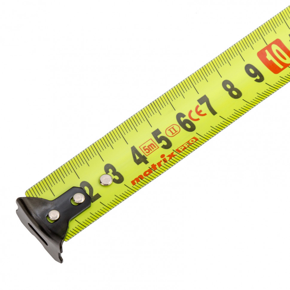 Рулетка Matrix PRO Neon 32592 в обрезиненном корпусе, с 3 механизмами фиксации ленты длиной 5 м и шириной 25 мм, служит для определения расстояний и размеров различных предметов. Крупные цифры на матовом желто-зеленом полотне хорошо видны, что облегчает считывание результатов. Измерительное полотно можно зафиксировать на нужной отметке при помощи стопора или одной из двух кнопок-пауз — это удобно при проведении большого количества замеров. Рулетка предназначена для выполнения профессиональных и бытовых измерительных работ.