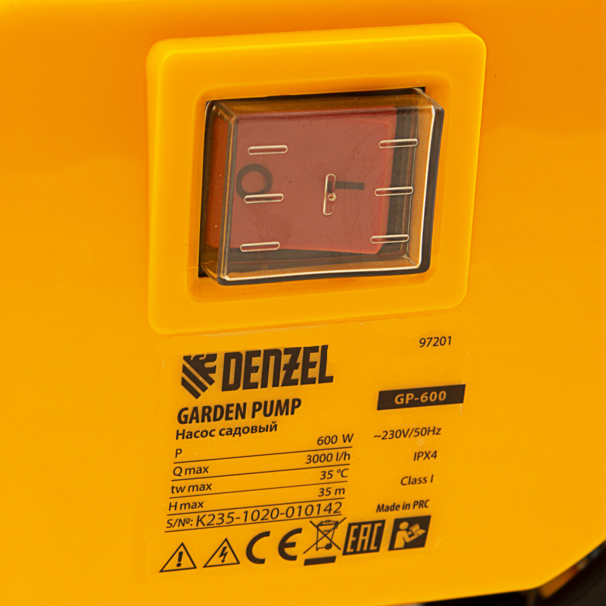 Садовый поверхностный насос GP 600, 600 Вт, 3000 л/ч, подъем 35 м, пластик Denzel