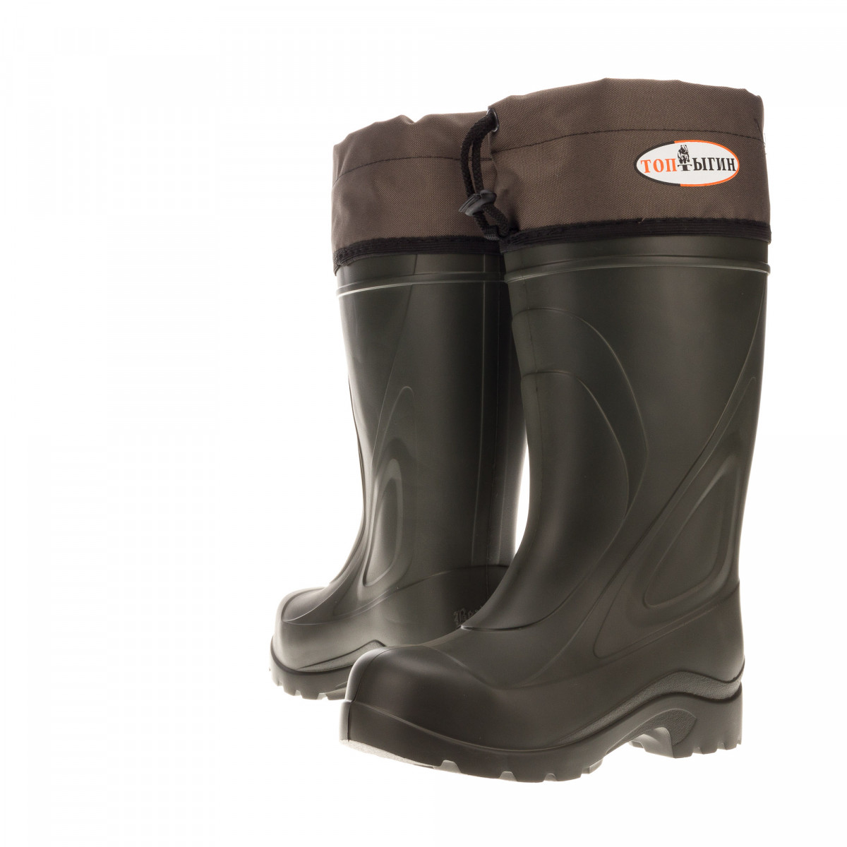 Мужские сапоги Топтыгин из ЭВА (этиленвинилацетат). Отличается высокой морозостойкостью и эластичностью. Рекомендуем для рыбаков и охотников. Специальный состав сырья позволяет сапогу сохранять свои характеристики при отрицательных температурах. Главное преимущество перед традиционно зимними бахилами, ботинками для суровых условий — это минимальный вес, вес пары сапог составляет 700 грамм. Затяжная манжета выполнена из водоотталкивающей ткани, что препятствует попаданию снега во внутрь сапога. Комплектуется утеплителем, изготовленным с применением натурального меха, что позволяет находится на морозе до -40С.