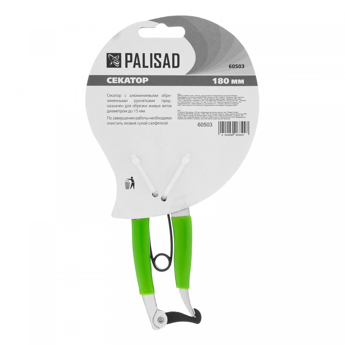 Секатор прямого реза, 180 мм, металлические обрезиненные рукоятки, Palisad