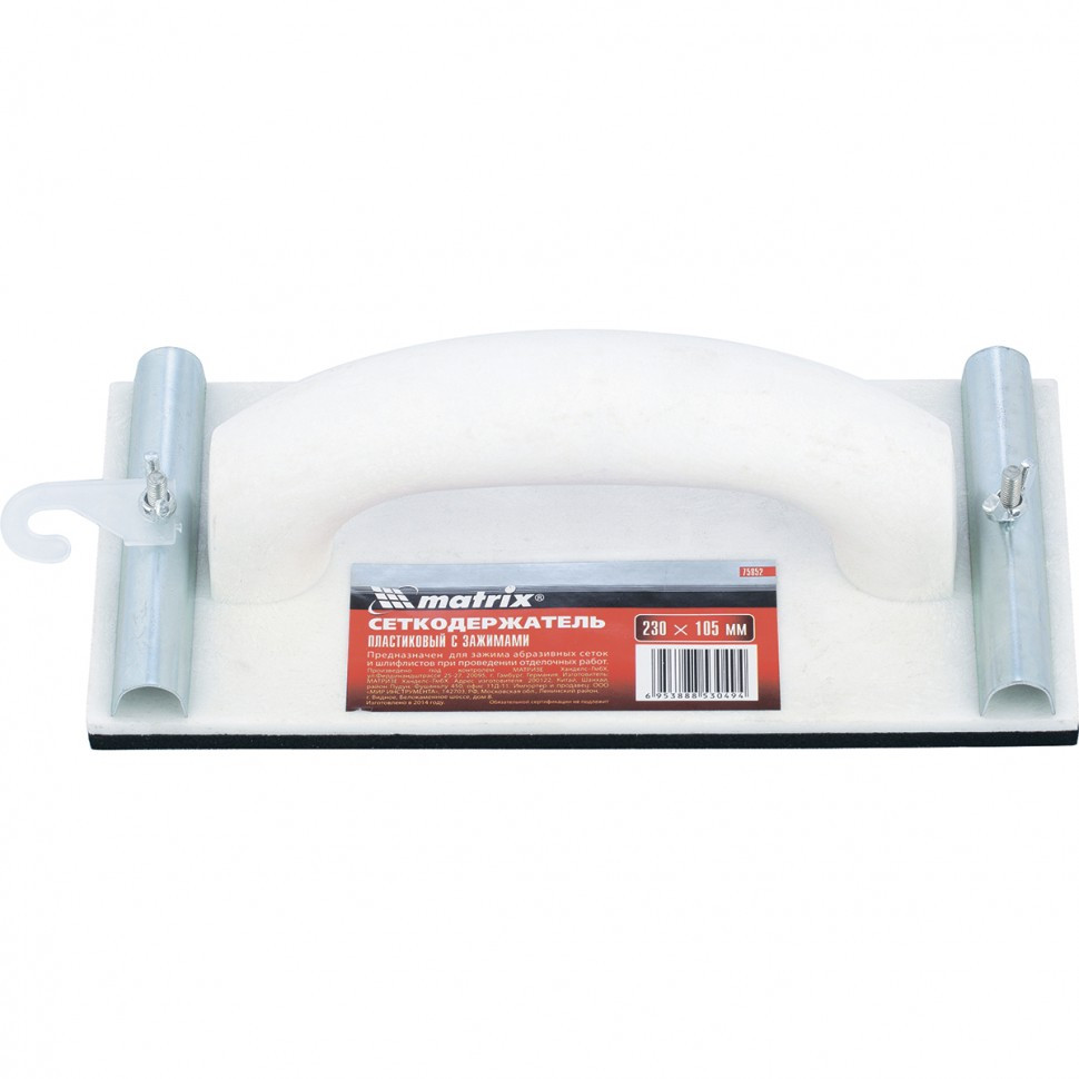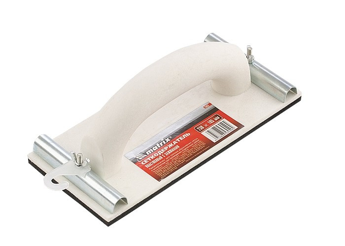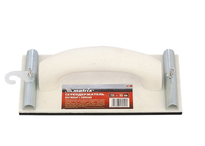 Пластиковый сеткодержатель Matrix 75852 с подошвой 230 х 105 мм, с зажимами, используется для ручного шлифования деревянных, шпатлеванных, металлических, пластмассовых и прочих твердых поверхностей. Сеткодержатель фиксирует абразивную стеклосетку или шлифлист и позволяет удалять старые отделочные покрытия, подготавливать поверхность под покраску, а также выполнять чистовую обработку.