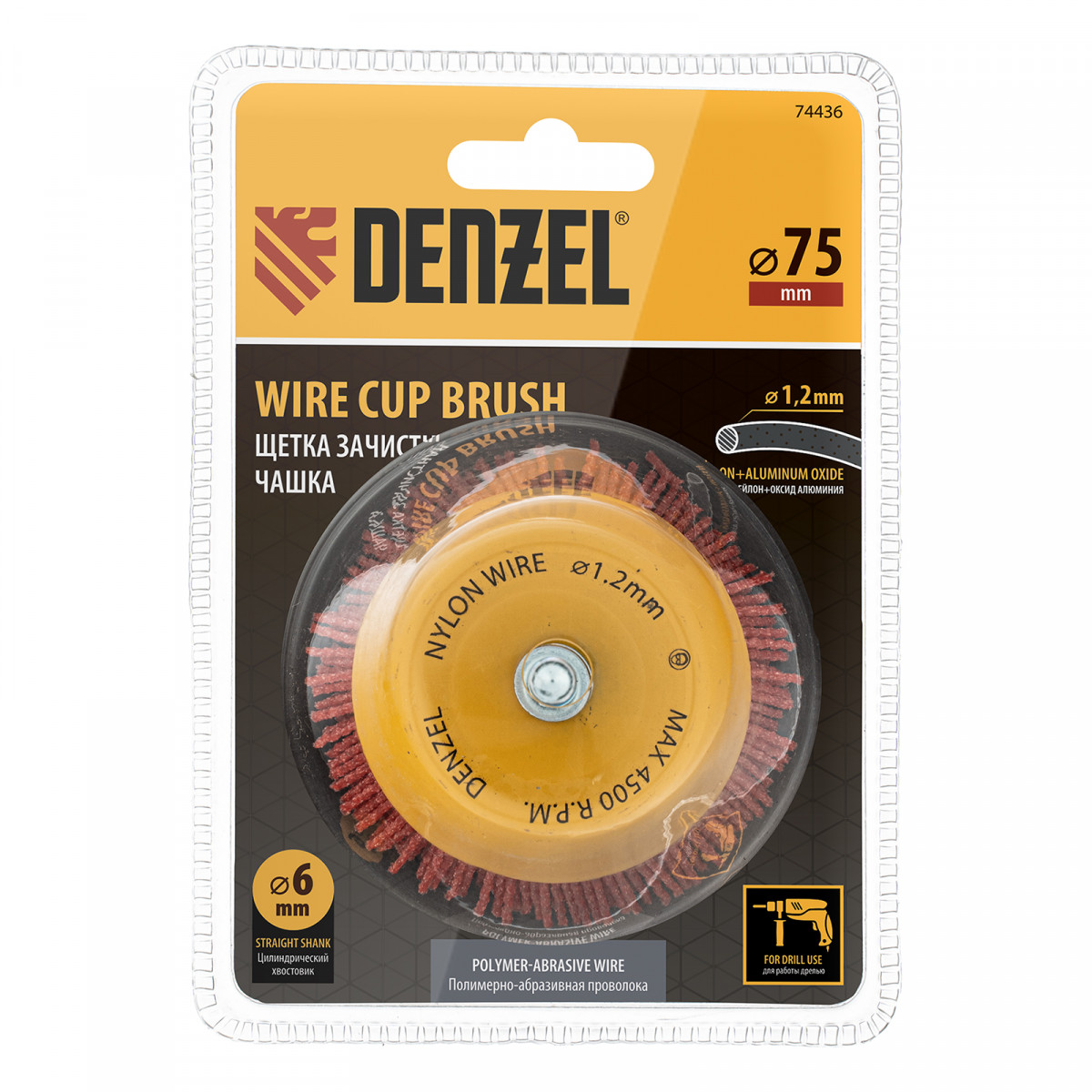 Щетка для дрели, 75 мм, Чашка, со шпилькой, нейлоновая щетина Denzel