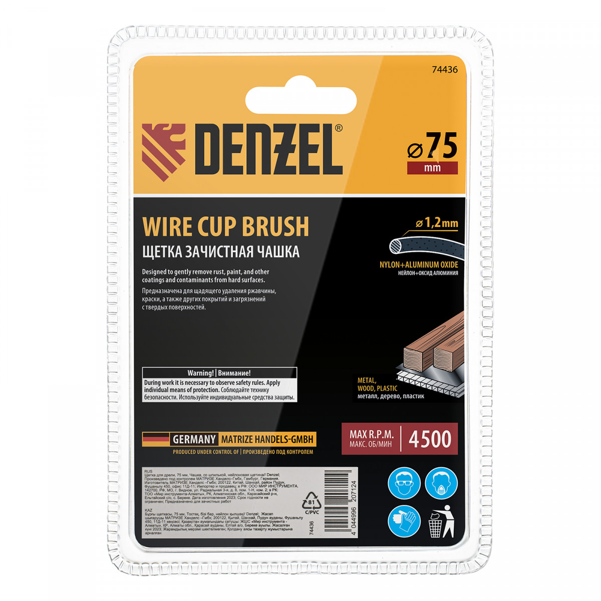Щетка Denzel 74436 в форме чашки диаметром 75 мм, со шпилькой и нейлоновой щетиной, — насадка для дрели, предназначенная для выполнения шлифовальных работ по пластику, древесине, стали и цветным металлам. Щетина изготовлена из высококачественного нейлона с нанесенным абразивом из оксида алюминия. Щетка оптимальна для деликатного удаления загрязнений, краски, пятен ржавчины с твердых поверхностей. Позволяет придать шероховатость поверхности, подходит для браширования древесины. Насадка удобна для обработки плоских деталей большой площади.