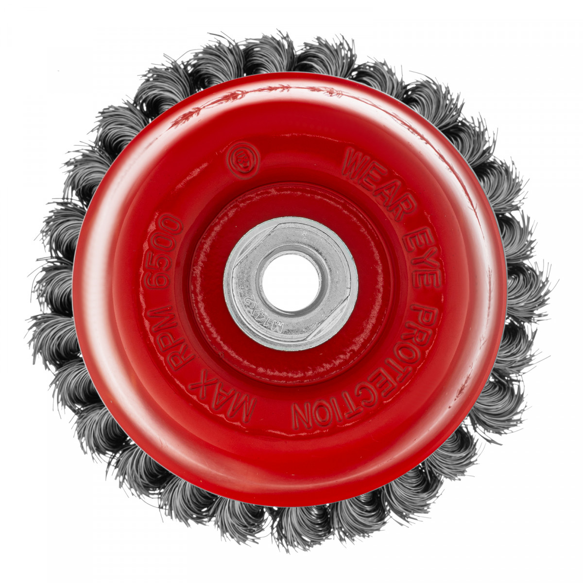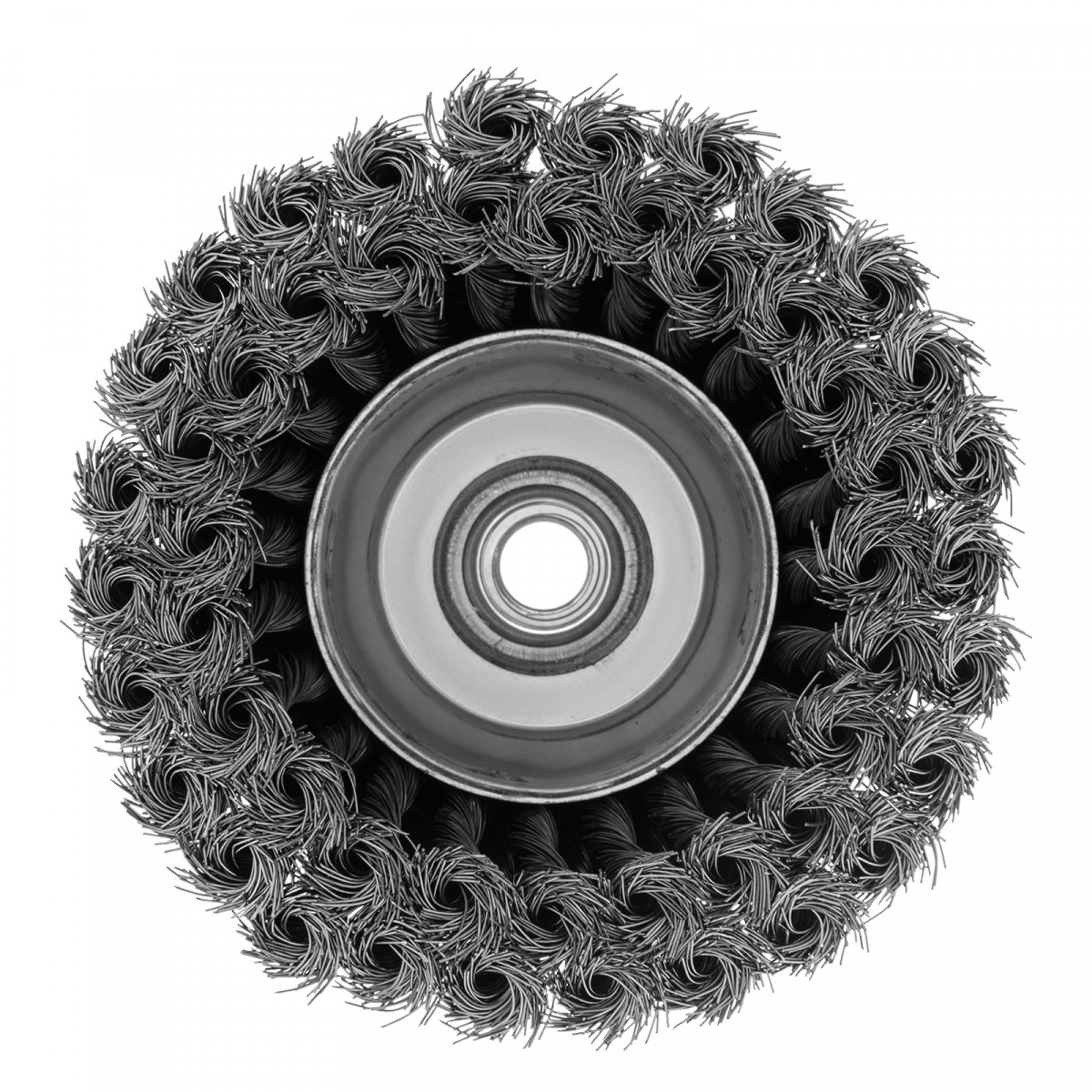 Двухрядная щетка Matrix «Чашка» 74678 диаметром 125 мм, с щетиной из крученой проволоки толщиной 0,35 мм, устанавливается на вал углошлифовальной машины с помощью гайки М14. Рекомендованная максимальная скорость вращения — до 6500 об/мин. Оснастка оптимальна для грубой (черновой) обработки: снятия старого слоя лакокрасочного покрытия и ржавчины, удаления загрязнений, зачистки сварных швов. Эффективно справляется с зачисткой больших поверхностей, подходит для выполнения работ повышенной сложности.