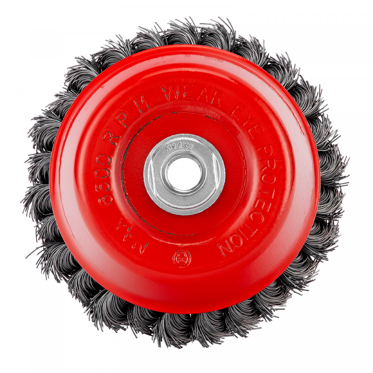 Двухрядная щетка Matrix «Чашка» 74683 диаметром 125 мм, с щетиной из крученой проволоки толщиной 0,5 мм, устанавливается на вал углошлифовальной машины с помощью гайки М14. Рекомендованная максимальная скорость вращения — до 6500 об/мин. Оснастка оптимальна для грубой (черновой) обработки: снятия старого слоя лакокрасочного покрытия и ржавчины, удаления загрязнений, зачистки сварных швов. Эффективно справляется с зачисткой больших поверхностей, подходит для выполнения работ повышенной сложности.