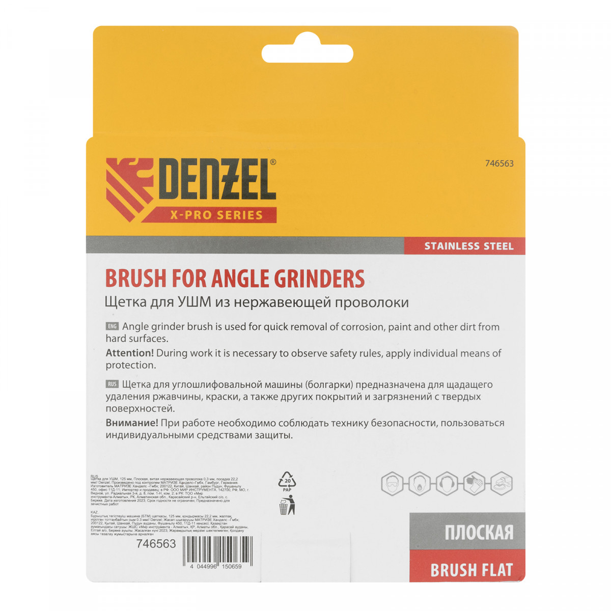 Плоская щетка для УШМ Denzel 746563 диаметром 125 мм, с щетиной из витой нержавеющей проволоки 0,3 мм, с посадкой 22,2 мм, постепенно снимает тонкий слой материала, поэтому ее используют для щадящей обработки металлических, деревянных, пластиковых поверхностей, а также изделий из нержавеющей стали. Щетка удаляет ржавчину, загрязнения, остатки лакокрасочных покрытий из труднодоступных мест, пазов и углов. Оснастка с посадкой 22,2 мм устанавливается на фланец углошлифовальной машины, что удобно для длительной работы без смены насадок. Рекомендуемая максимальная скорость вращения составляет 4500 об/мин. Во время работы следует использовать средства индивидуальной защиты. Щетку применяют в строительстве, машиностроении, а также в быту.