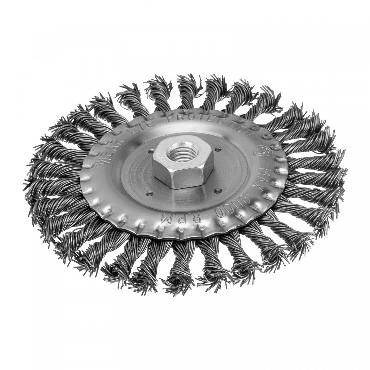 Плоская щетка Matrix 74645 диаметром 150 мм, с щетиной из крученой проволоки толщиной 0,8 мм и гайкой М14, — оснастка для УШМ, предназначенная для грубой (черновой) обработки поверхностей. Максимально допустимая скорость вращения шпинделя — 9000 об/мин. Щетка позволяет снять толстый слой ржавчины, лакокрасочных покрытий, загрязнений, а также зачистить сварные швы. Плоская форма удобна для обработки углов, изгибов и других труднодоступных мест.