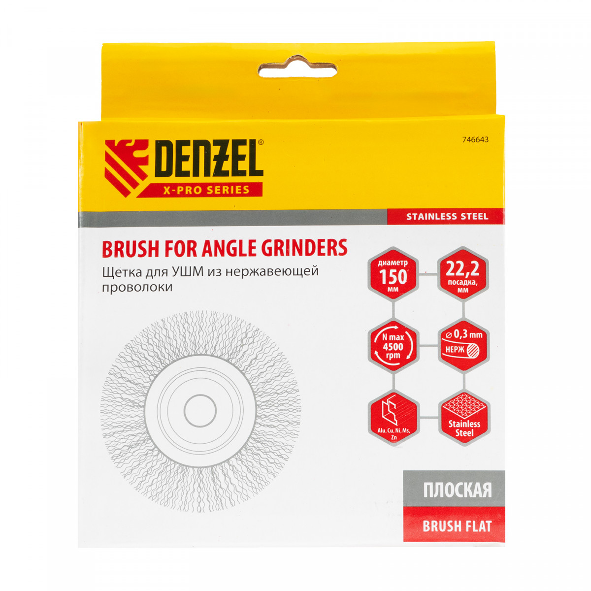 Плоская щетка для УШМ Denzel 746643 диаметром 150 мм, с щетиной из витой нержавеющей проволоки 0,3 мм, с посадкой 22,2 мм, постепенно снимает тонкий слой материала, поэтому ее используют для щадящей обработки металлических, деревянных, пластиковых поверхностей, а также изделий из нержавеющей стали. Щетка удаляет ржавчину, загрязнения, остатки лакокрасочных покрытий из труднодоступных мест, пазов и углов. Оснастка с посадкой 22,2 мм устанавливается на фланец углошлифовальной машины, что удобно для длительной работы без смены насадок. Рекомендуемая максимальная скорость вращения составляет 4500 об/мин. Во время работы следует использовать средства индивидуальной защиты. Щетку применяют в строительстве, машиностроении, а также в быту.