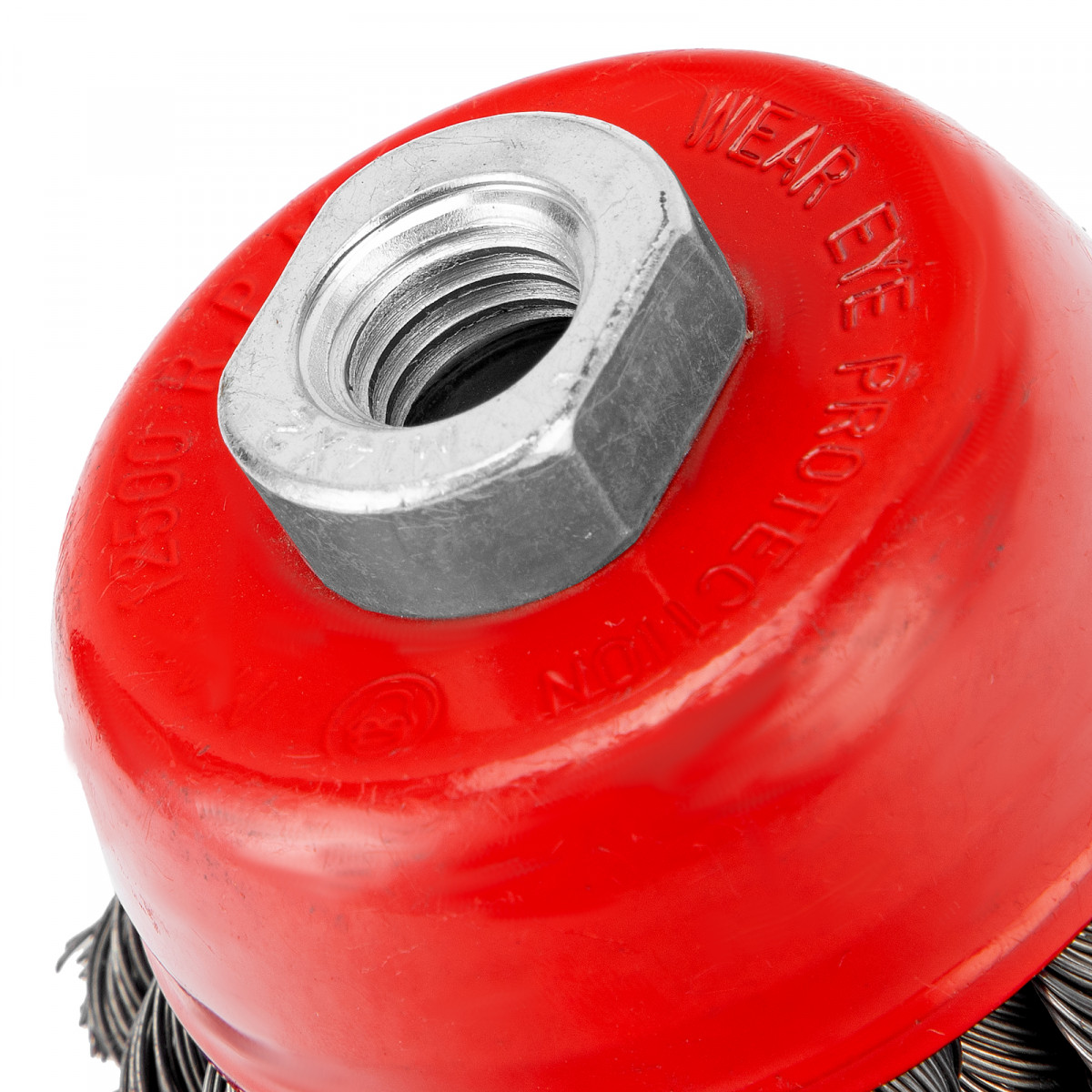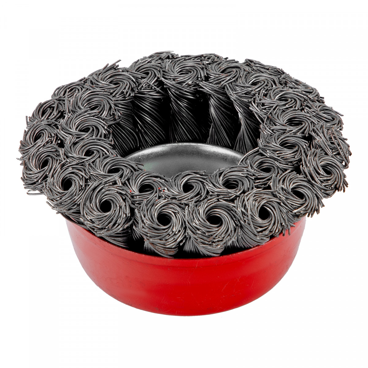 Двухрядная щетка Matrix «Чашка» 74676 диаметром 75 мм, с щетиной из крученой проволоки толщиной 0,35 мм, устанавливается на вал углошлифовальной машины с помощью гайки М14. Рекомендованная максимальная скорость вращения — до 12500 об/мин. Оснастка оптимальна для грубой (черновой) обработки: снятия старого слоя лакокрасочного покрытия и ржавчины, удаления загрязнений, зачистки сварных швов. Эффективно справляется с зачисткой больших поверхностей, подходит для выполнения работ повышенной сложности.