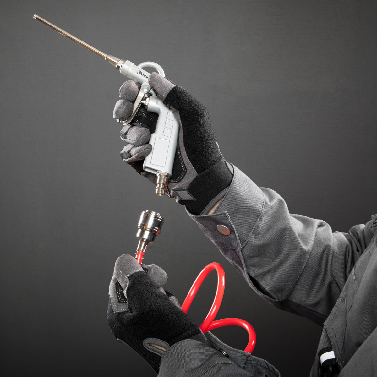 • Быстроразъемное соединение ускоряет подключение пневмоинструментов, что экономит время и силы мастера.