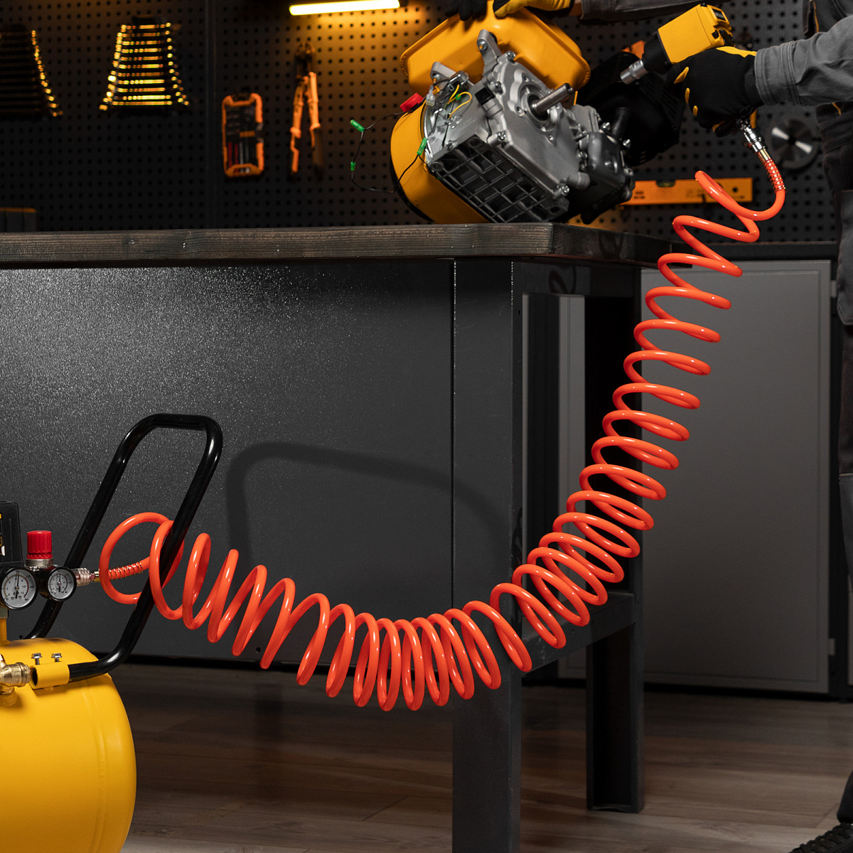 • Спиральная форма — шланг удобен в хранении, а во время работы не мешает передвижению.