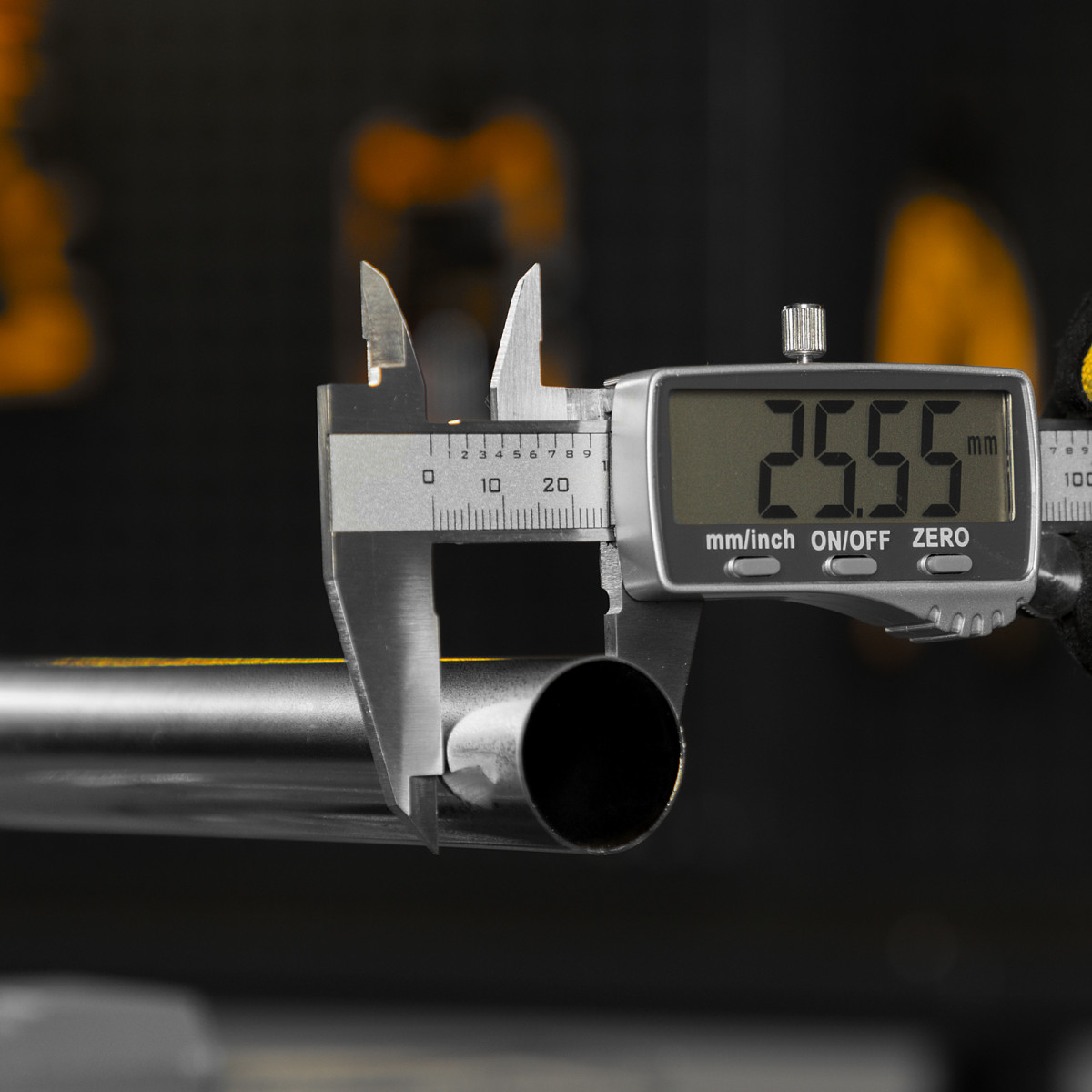 Электронный штангенциркуль Denzel 31614 со шкалой длиной 150 мм, с большим дисплеем и глубиномером, позволяет определять внутренние и внешние размеры различных деталей. Цена деления составляет 0,01 мм. Штангенциркуль позволяет получать результаты высокой точности: погрешность составляет ±0,02 мм при измерении размеров до 100 мм, и ±0,03 мм — до 150 мм. Двустороннее положение губок облегчает проведение работ. Инструмент пригодится на производстве, в мастерской, гараже, а также будет полезен в быту.