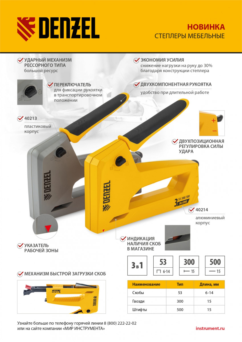 Степлер мебельный, алюминиевый корпус, тип 53, 6-14 мм, тип 300, 15 мм, тип 500, 15 мм Denzel