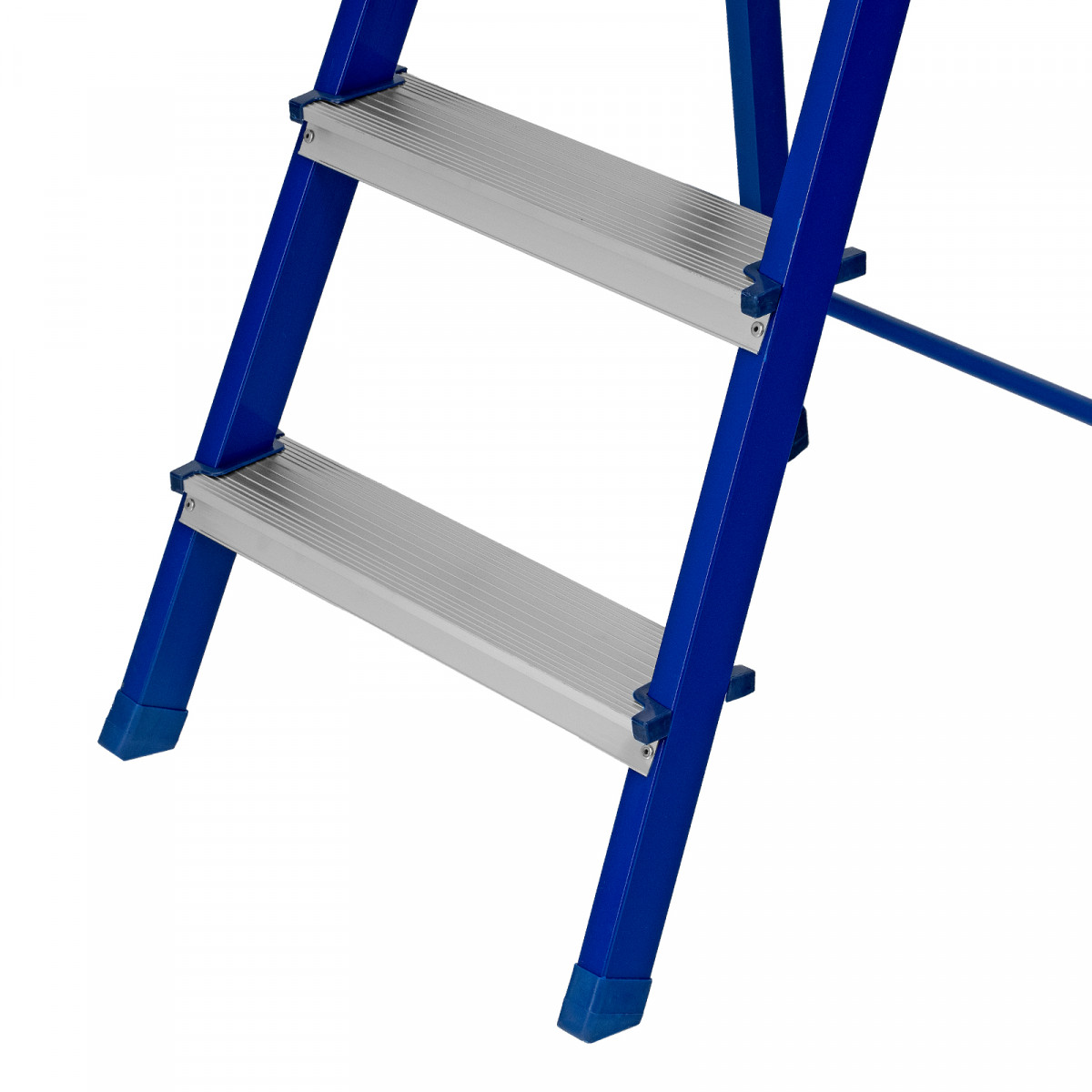 • Надежная конструкция — рама изготовлена из профилированной стали, стальная верхняя площадка с зацепами прочно фиксирует стремянку в рабочем положении.