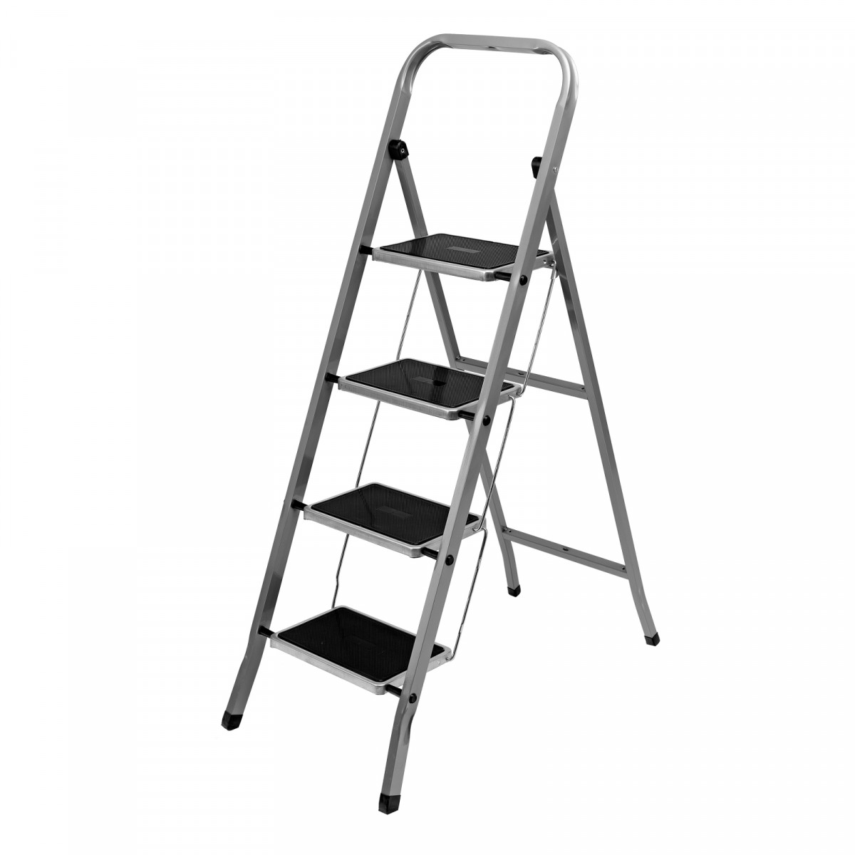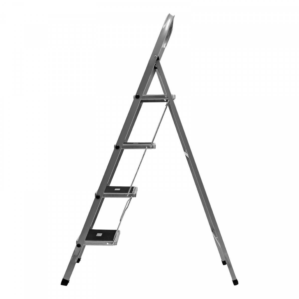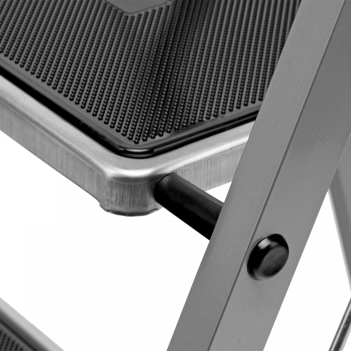 Стремянка выдерживает нагрузку до 120 кг благодаря раме и ступеням из стали.