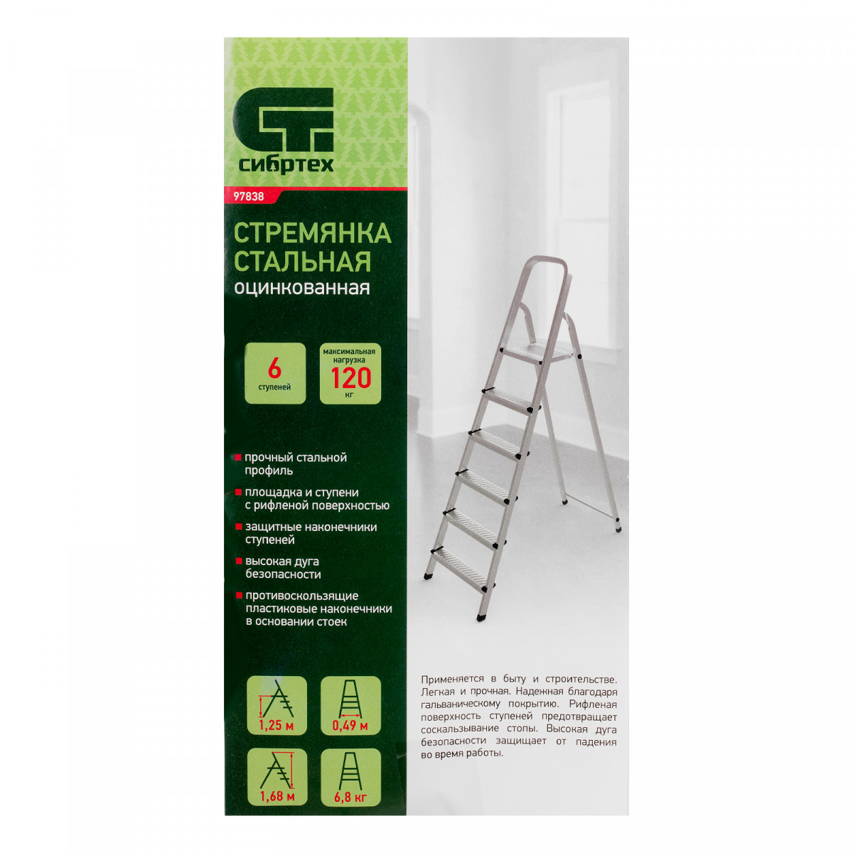 Стальная оцинкованная стремянка Сибртех 97838 с 6 ступенями позволяет повесить полку, картину или шкафчик, достать нужный предмет и решить другие задачи, для которых требуется доступ к предметам на высоте. Рама и ступени из стального профиля выдерживают вес до 120 кг. Расстояние от опорной поверхности до площадки составляет 121 см, при среднем росте пользователя 170 см рабочая высота лестницы — 321 см. Необходимо соблюдать технику безопасности: размещать стремянку только на ровной плоскости и не использовать ее для работы с дрелью, шуруповертом и другим электроинструментом.