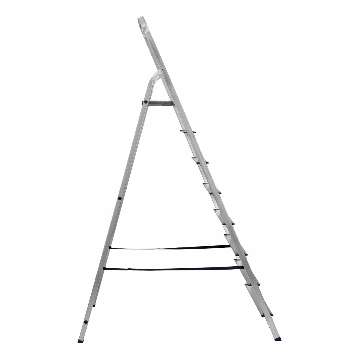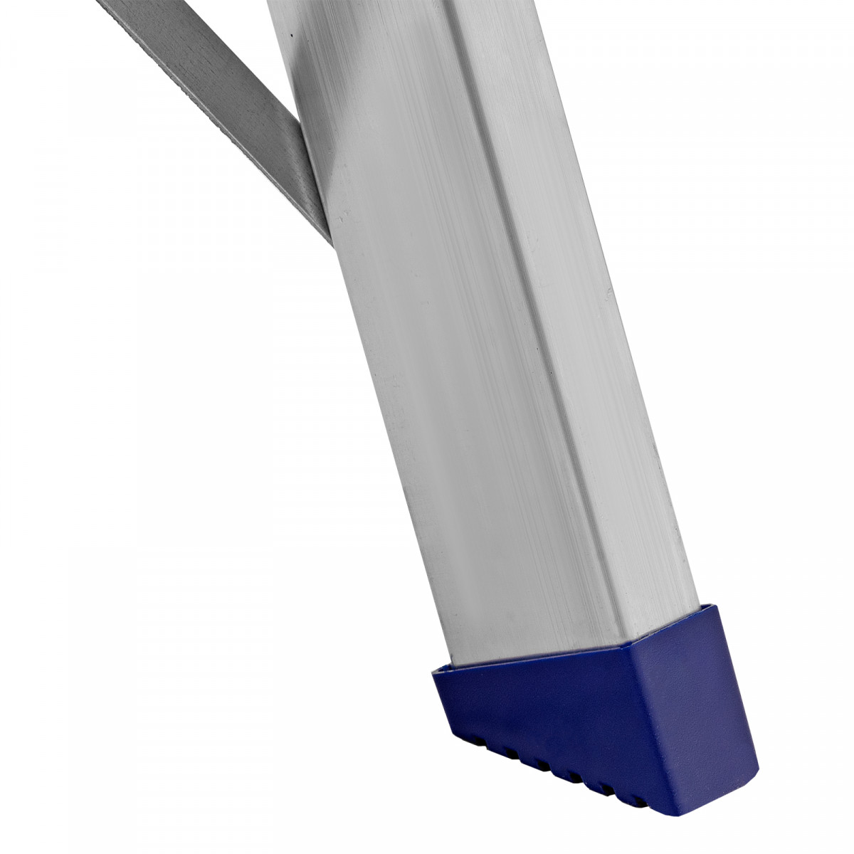 • Надежность — рама из прямоугольного алюминиевого профиля выдерживает нагрузку до 150 кг, широкие ступени закреплены заклепками, страховочные стяжки повышают прочность конструкции.