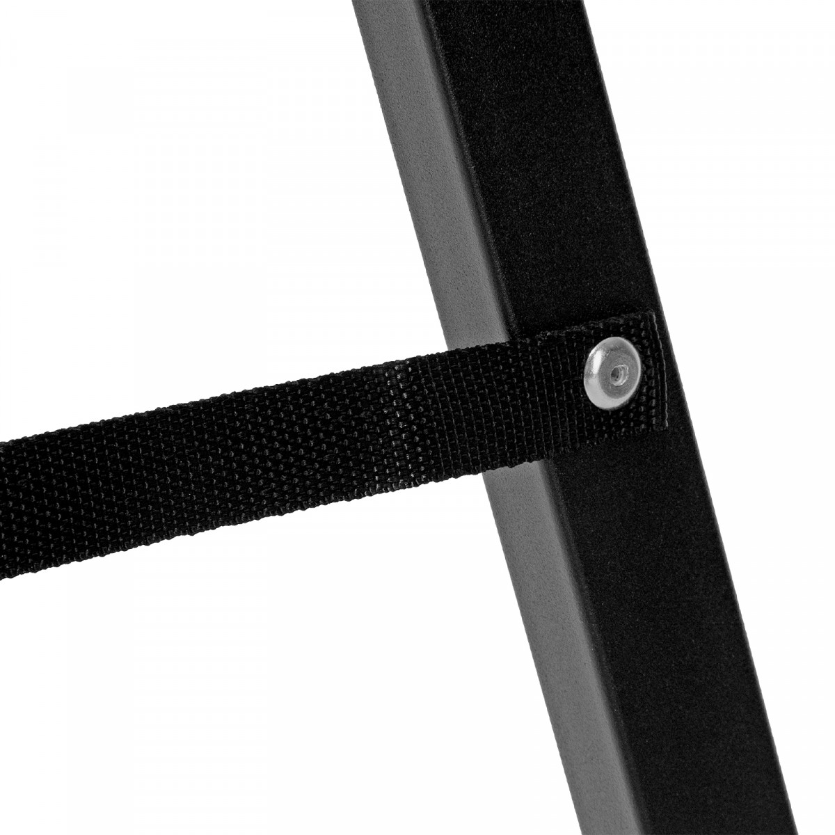 - Надежная фиксация в рабочем положении — на верхней площадке имеются специальные зацепы, опоры дополнительно удерживаются страховочными лентами.