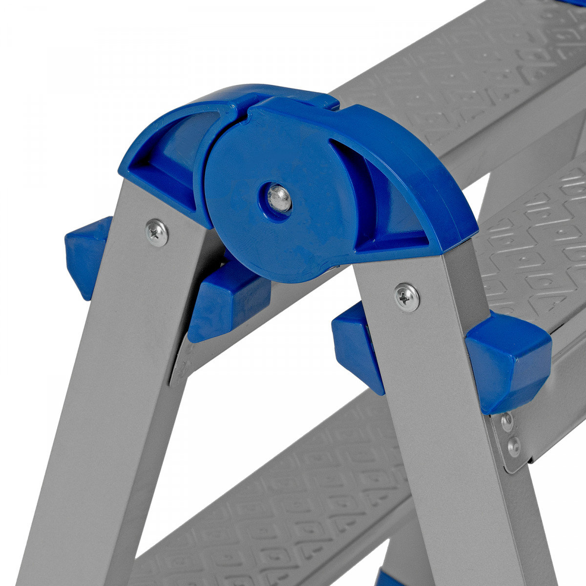 Стремянка двухсторонняя Сибртех 97982 со стальным профилем и 2 стальными ступенями помогает решать бытовые задачи на высоте, превышающей человеческий рост. Ее используют, чтобы доставать предметы с антресолей или шкафов, проводить уборку, менять лампочки, вешать полки или картины. Работать с электроинструментом на ней не рекомендуется. Стремянка с пластиковым складным механизмом повышенной стабильности и широким основанием очень устойчива на ровной поверхности. Площадка находится на высоте 44 см от опорной поверхности, рабочая высота стремянки составляет 244 см (при среднем росте пользователя 170 см).