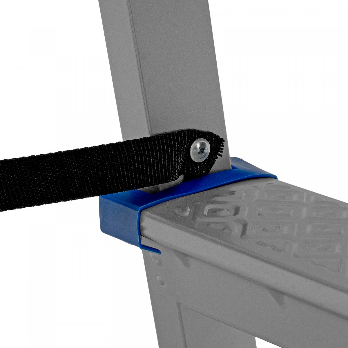 • Надежность — стремянка из стального профиля с широкими ступенями выдерживает вес до 120 кг, страховочные ленты из полиэстера повышают устойчивость.