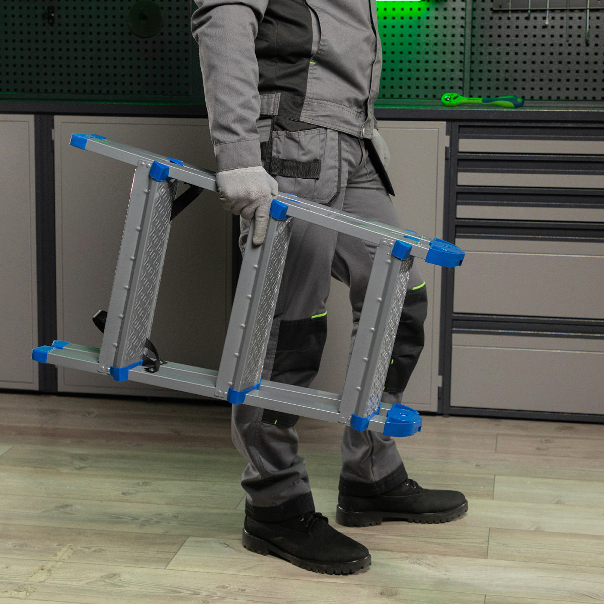 - Удобная транспортировка — стремянка весом 4 кг легко складывается, ее размеры в сложенном состоянии 735 х 435 х 160 мм.