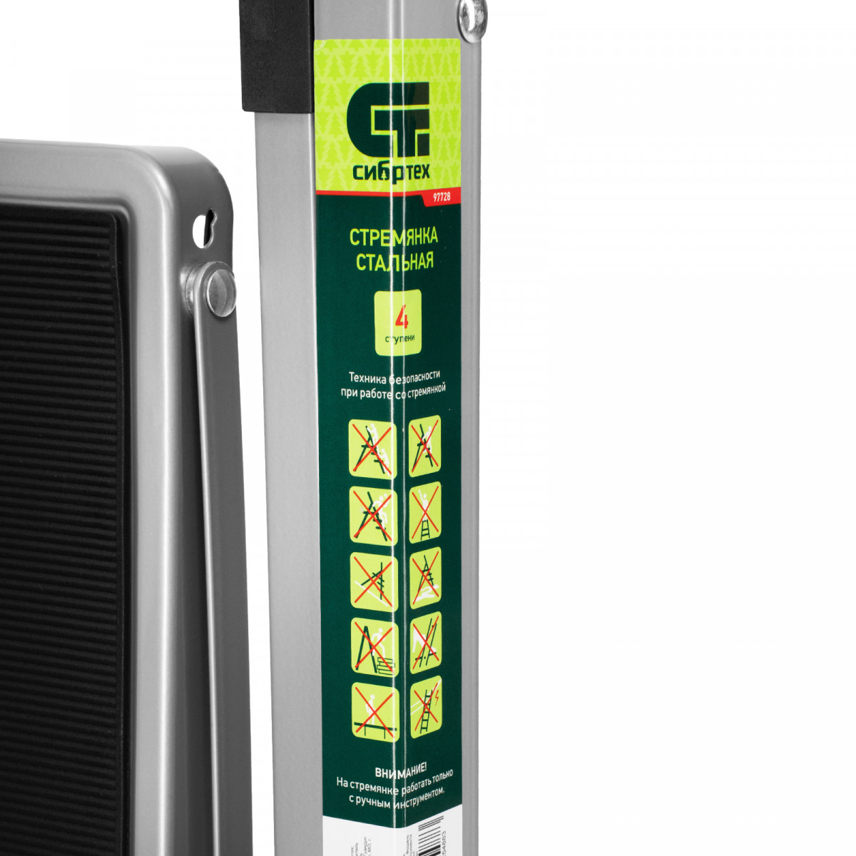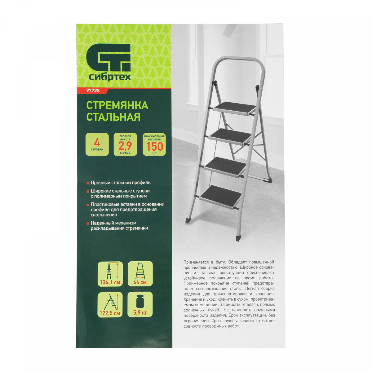 Стальная стремянка Сибртех 97728 с 4 широкими ступенями размером 20 x 30 см, с полимерным покрытием, позволяет выполнять различные работы на высоте, превышающей человеческий рост. С ее помощью можно достать нужный предмет с полки, покрасить стену, поменять лампочку, вытереть пыль на шкафу и т.д. Верхняя ступень находится на высоте 88 см от опорной поверхности, рабочая высота составляет 288 см (при среднем росте пользователя 170 см). Дуга безопасности и широкие ступени с нескользящим покрытием обеспечивают устойчивое положение пользователя. Стремянку следует размещать на ровной поверхности и использовать для работы только с ручным инструментом.