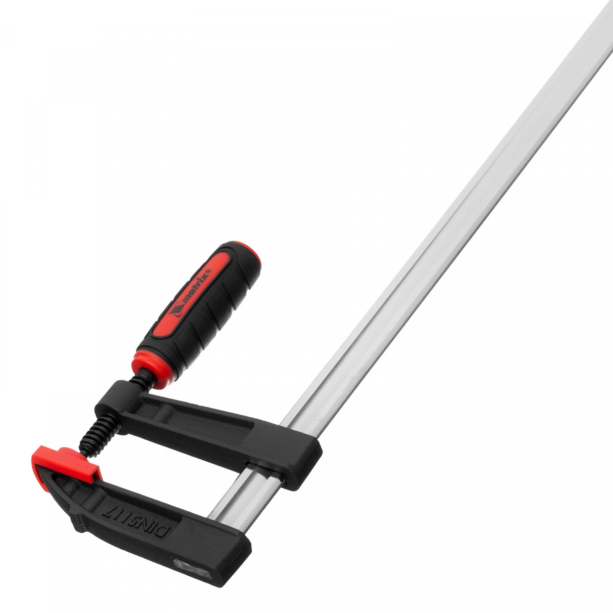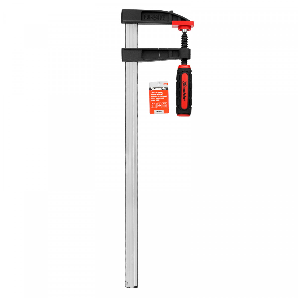 Усиленная F-образная струбцина Matrix 20409 размером 400 х 80 х 480 мм используется для зажима металлических, деревянных и других заготовок для их последующей обработки или сборки. Представляет собой штангу, на которой установлены 2 кронштейна — неподвижный и подвижный. Деталь помещается между ними и прижимается к губкам при помощи винтового зажима с трапециевидной резьбой. Величина захвата регулируется при помощи подвижного кронштейна и может достигать 400 мм. Струбцину используют для проведения слесарных и столярных работ. Металлическая конструкция выдерживает высокую температуру, поэтому инструмент пригодится для выполнения сварочных работ (перед началом необходимо снять пластиковые накладки с губок).