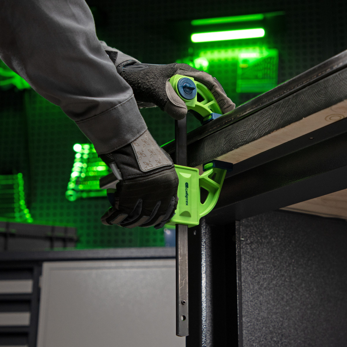 F-образная быстрозажимная струбцина Сибртех 20563 длиной 360 мм, с шириной и глубиной зажима 150 и 70 мм соответственно, в пластиковом корпусе, с фиксатором и двухкомпонентной рукояткой, позволяет зажимать заготовки для их дальнейшей обработки или сборки. Помогает решать множество задач благодаря оптимальной глубине зажима. Пластинчатый механизм пошагово перемещает подвижную губку вдоль направляющей до достижения максимально плотного захвата детали. Фиксатор препятствует движению губки в обратную сторону. Струбцина пригодится в столярной мастерской, а также будет полезна в быту.