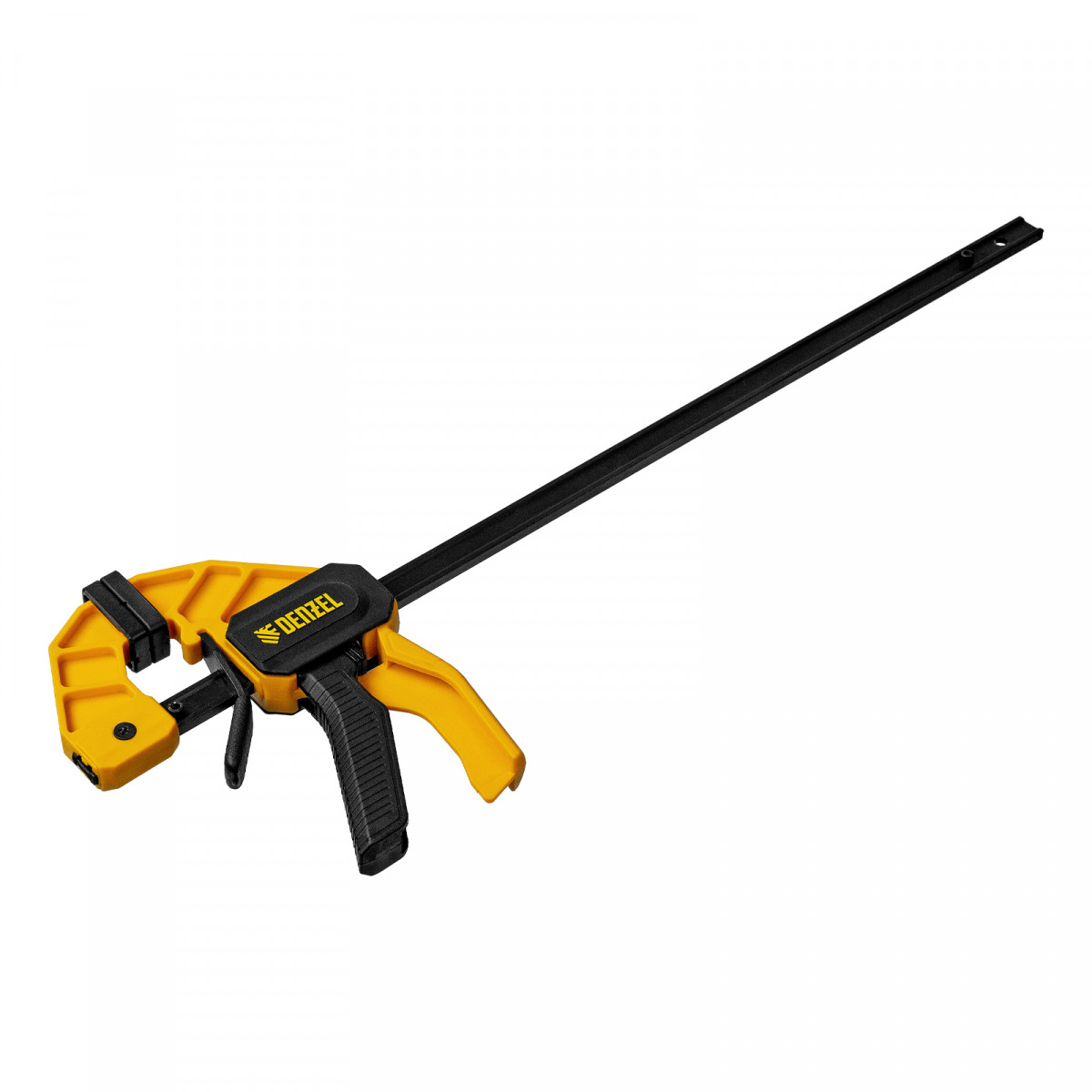 - Комфортное использование — струбцина весит всего 360 г, обрезиненная кнопка фиксации обеспечивает удобный захват.