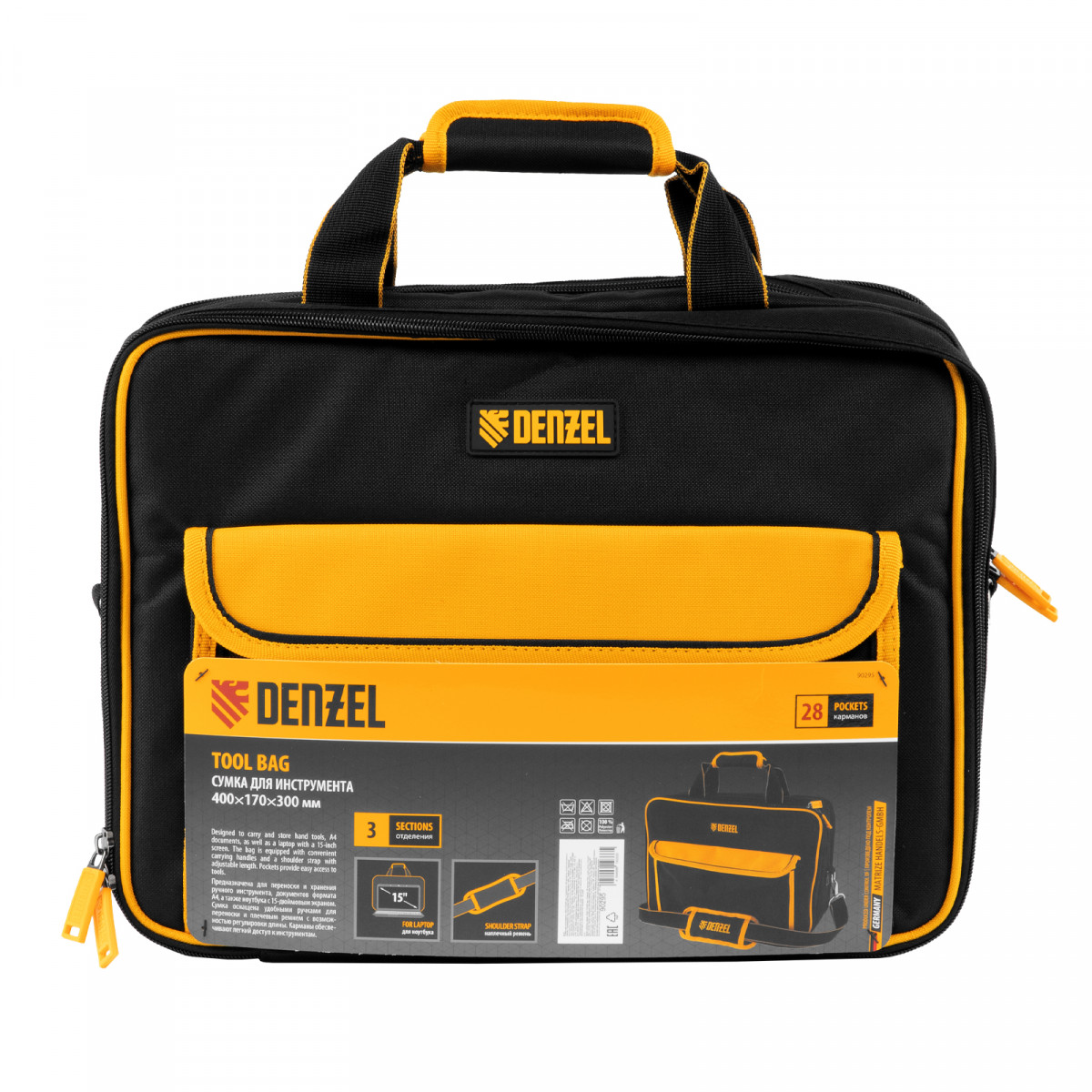 Сумка для инструмента, 400х170х300 мм, 3 отделения, 28 карманов, наплечный ремень Denzel
