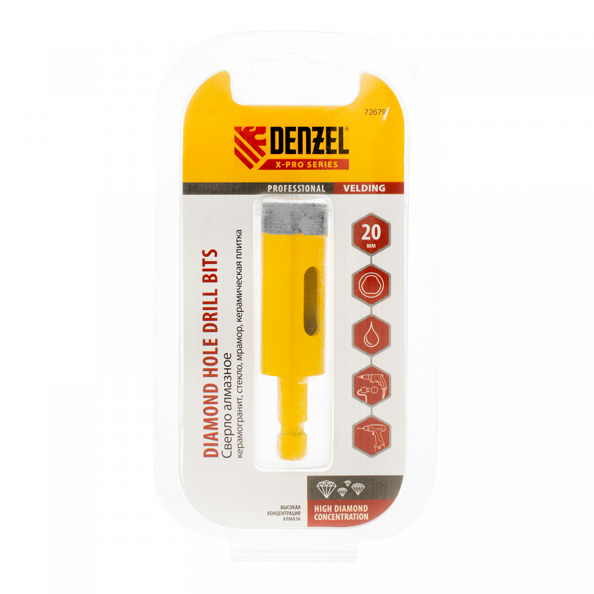 Сверло алмазное по керамограниту, 20 мм, мокрая резка, трехгранный хвостовик Denzel