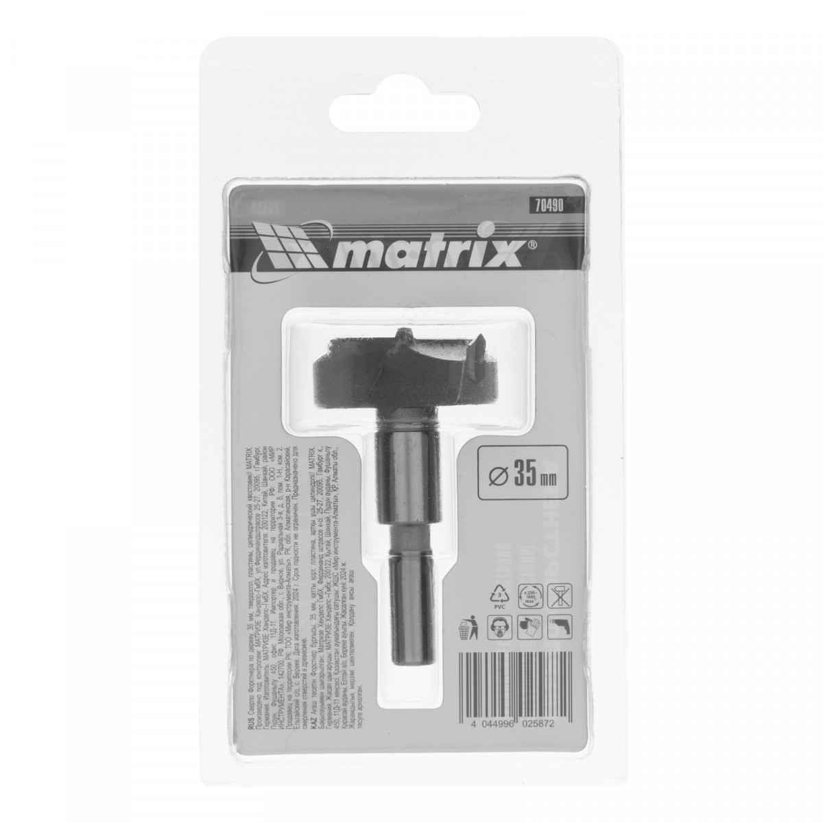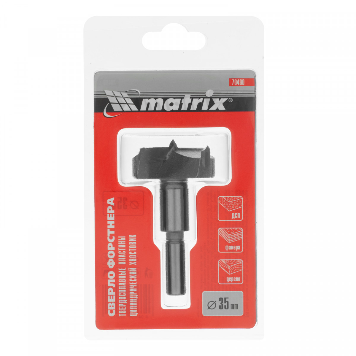 Сверло Форстнера Matrix 70490 диаметром 35 мм, с твердосплавной пластиной и цилиндрическим хвостовиком, используется в мебельной промышленности. Позволяет получать глухие отверстия большого диаметра, с ровными краями и дном. Сверло применяется также во время установки замков, дверных петель и т. д. Оснастка рассчитана на сверление древесины любой твердости, фанеры, ДСП и других материалов.