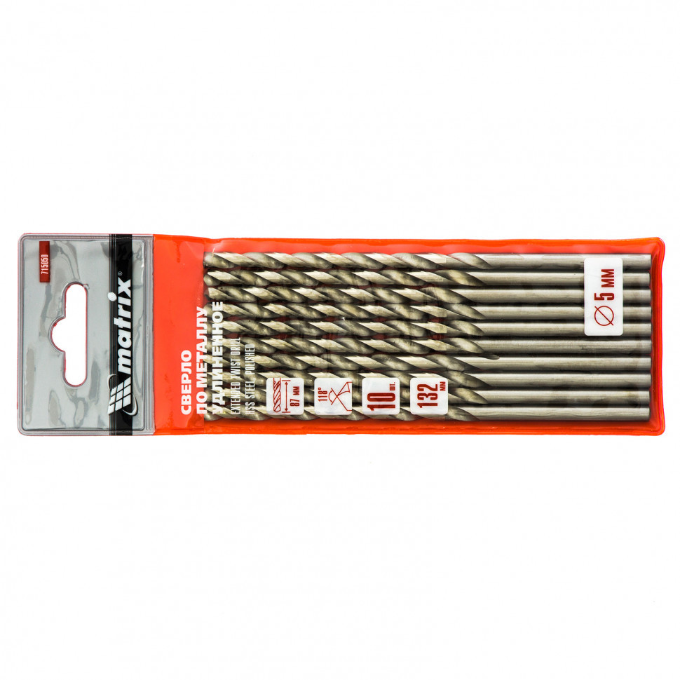 Полированное удлиненное сверло по металлу Matrix 715050 размером 5,0 х 132 мм, из стали HSS, с цилиндрическим хвостовиком, 10 шт. в упаковке, благодаря удлиненному профилю подходит для глубокого сверления. Угол заточки сверл составляет 118° и является оптимальным для работы с черными металлами, сталью, чугуном и твердой бронзой.