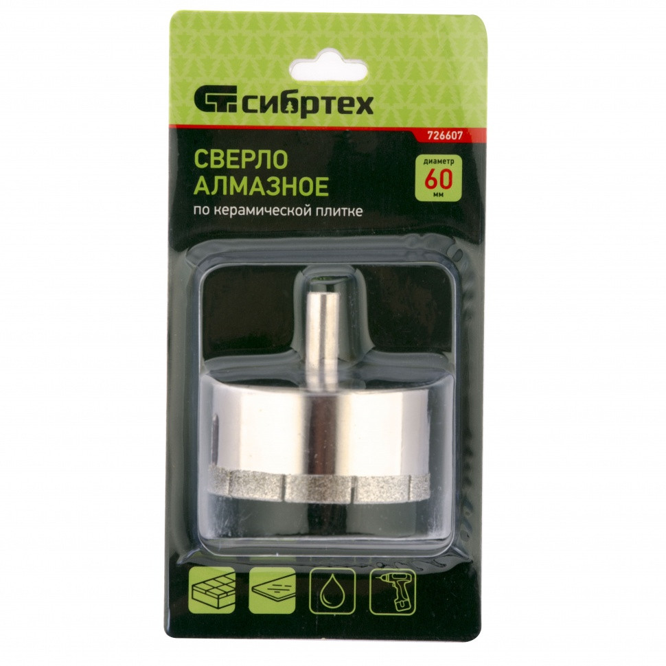Сверло Сибртех 726607 размером 60 х 55 мм, с цилиндрическим хвостовиком, используется для получения ровных отверстий без сколов в стекле и керамической плитке. Устанавливается в патрон дрели или шуруповерта, работающих в диапазоне 350-700 об/мин. Во время работы рекомендуется применять водяное охлаждение — это существенно увеличит ресурс оснастки. Использование кондуктора (арт. 72830) позволяет точно позиционировать сверло и облегчает засверливание. Оснастка подходит для выполнения работ небольшого объема и рекомендована для использования в быту.
