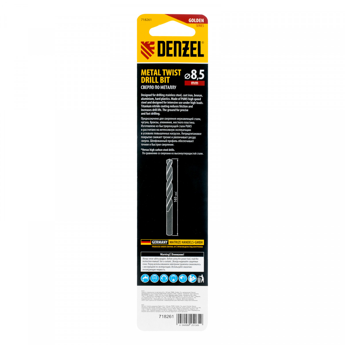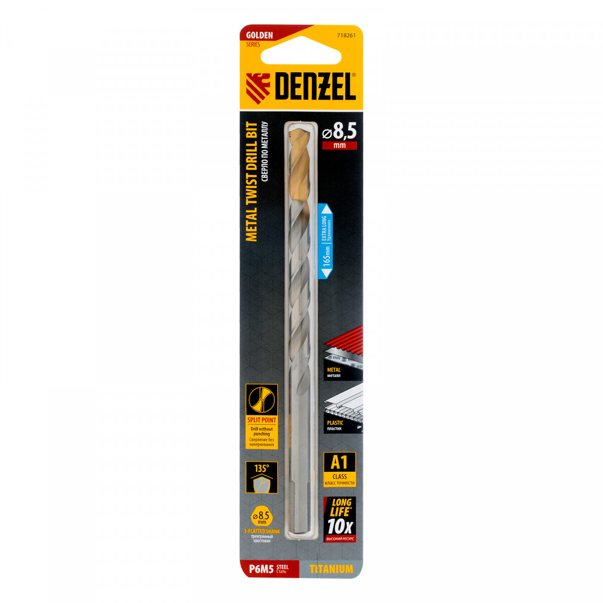 Сверло спиральное по металлу 8,5 х 165 мм, Р6М5, Golden Tip, удлиненное Denzel