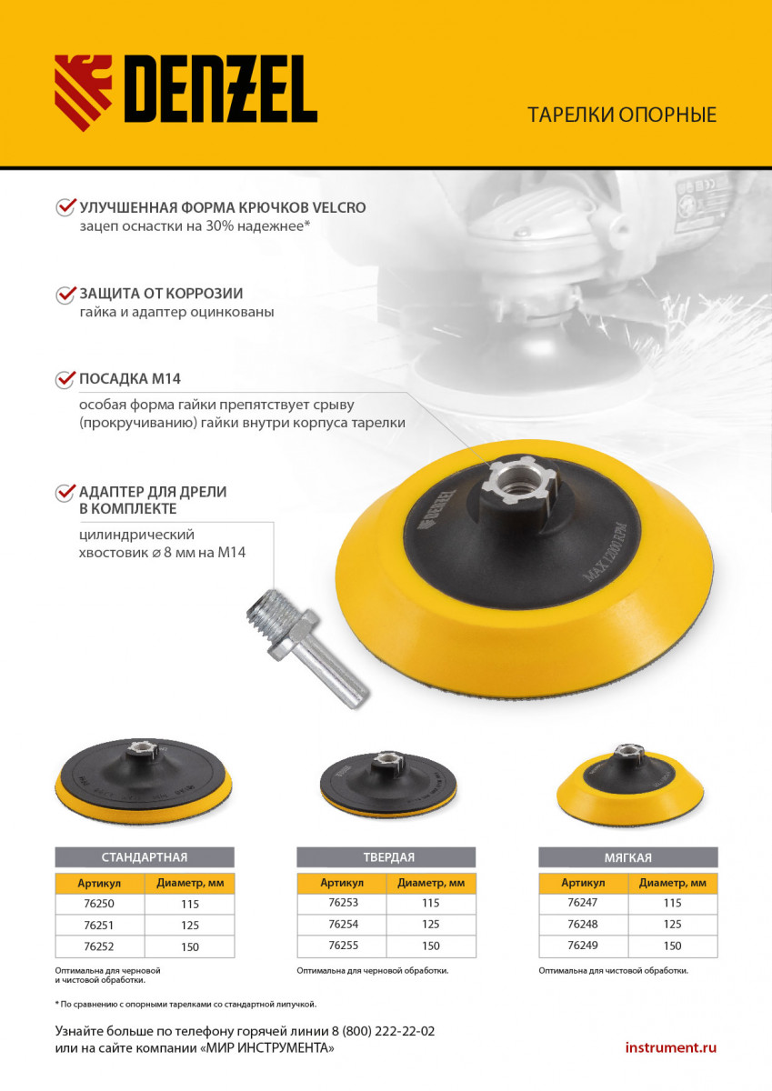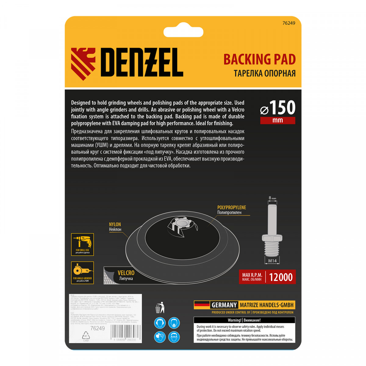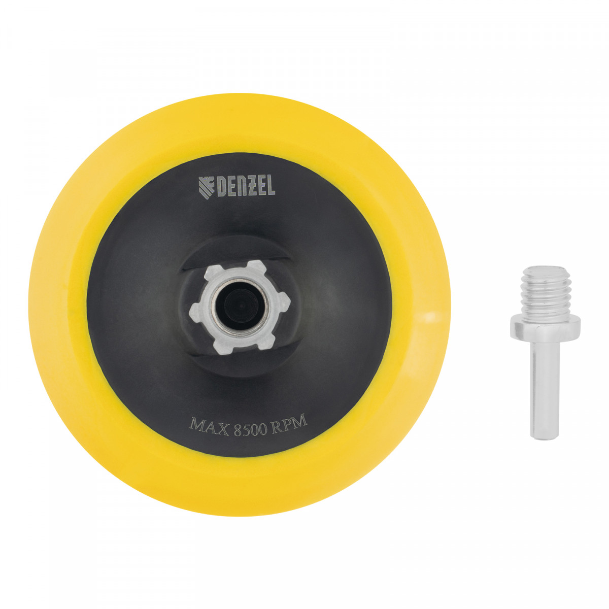 Тарелка опорная для дрели и УШМ с липучкой, 150 мм, мягкая, с адаптером c М14 на d8 Denzel