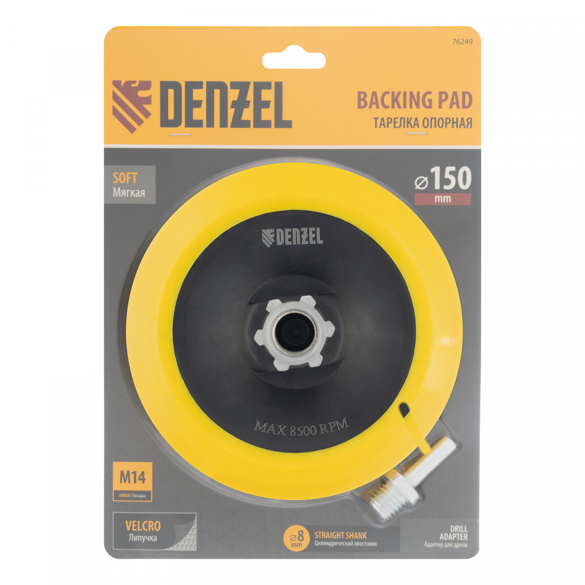 Тарелка опорная Denzel 76249 диаметром 150 мм, с липучкой и адаптером с М14 на d8, мягкая, устанавливается на дрель или углошлифовальную машину (УШМ). Используется для крепления абразивных или полировальных кругов на ворсовой основе, позволяет подготовить поверхность для дальнейшей обработки или придать ей финишную гладкость.