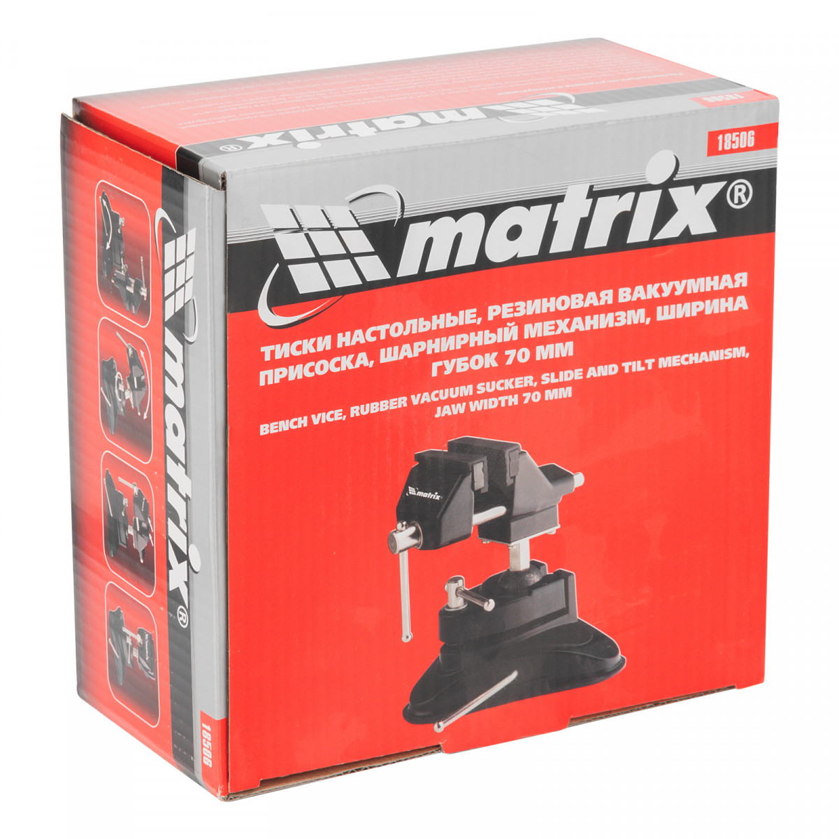 Настольные тиски Matrix 18506 с резиновой вакуумной присоской и шарнирным механизмом, имеют рабочие губки шириной 70 мм и используются для фиксации обрабатываемых деталей. Максимальное расстояние между губками составляет 68 мм, что позволяет закреплять небольшие заготовки для выполнения ювелирных, ремонтных и других тонких работ.
