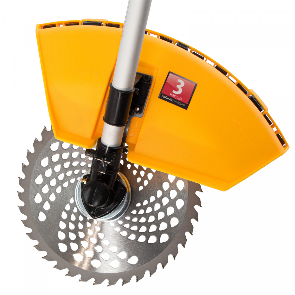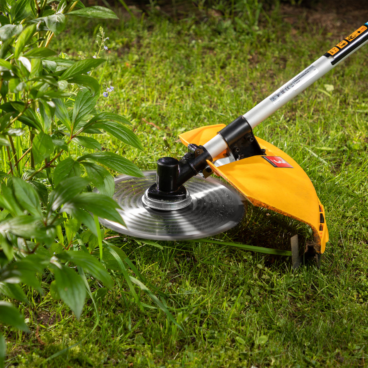 • Дополнительные возможности — можно приобрести и установить на триммер диски Denzel 96323, 96325 для быстрого удаления растительности с жесткими стеблями (полыни, крапивы, лебеды), 96328 для скашивания молодых побегов кустарника диаметром до 3 мм.