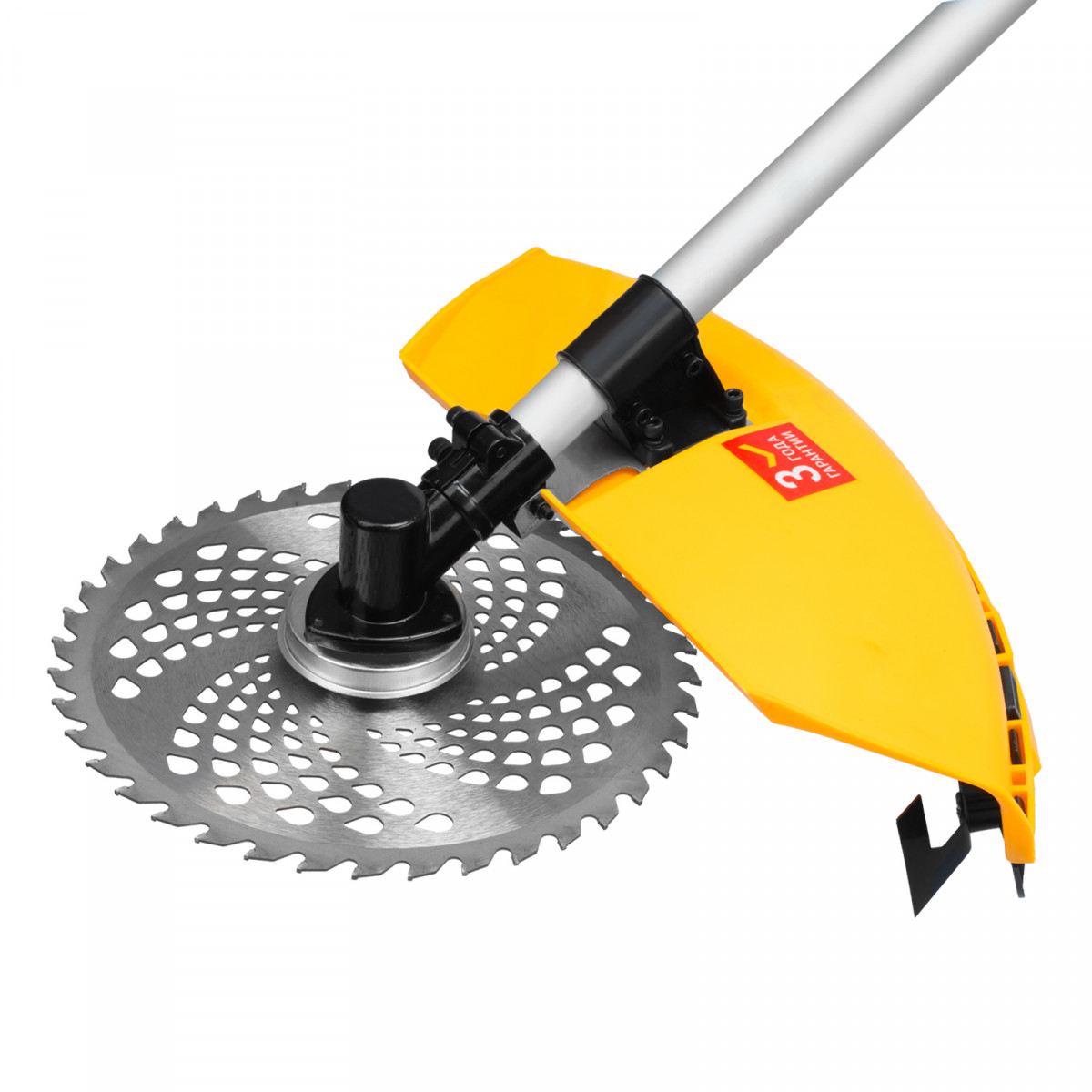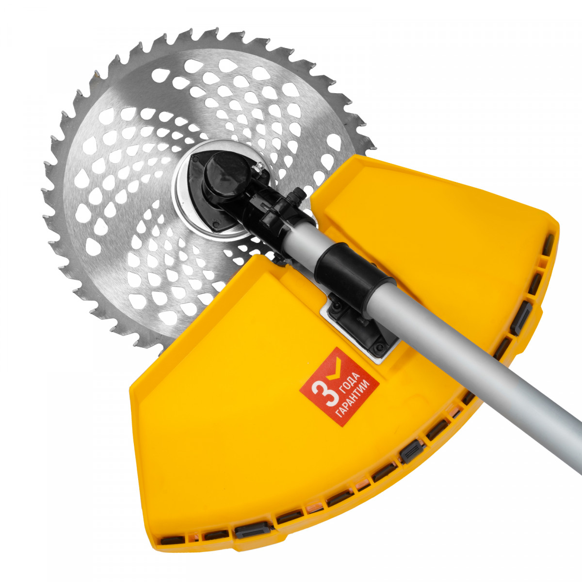 - Дополнительные возможности — можно приобрести и установить на триммер диски Denzel 96323, 96325 для быстрого удаления растительности с жесткими стеблями (полыни, крапивы, лебеды), 96328 для скашивания молодых побегов кустарника диаметром до 3 мм.