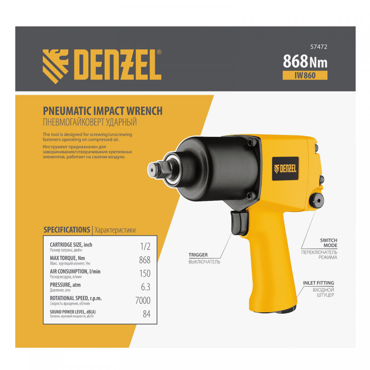 Ударный пневмогайковерт IW860, 1/2", 7000 об/мин, 868 Нм Denzel