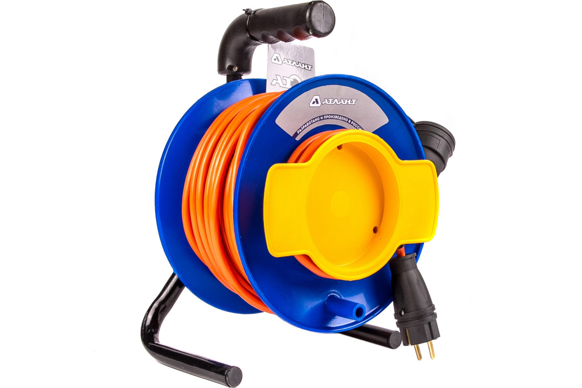 Силовой удлинитель Атлант 2200 Вт 40м на садовой катушке (б/з) применяется в основном на садовых и дачных участках, для подключения газонокосилок, снегоуборочной техники и другого инструмента. Устройство представляет собой пластиковую катушку с намотанным проводом типа ПВС, также на корпусе располагается устойчивая подставка и специальная рукоятка для удобства переноски удлинителя.