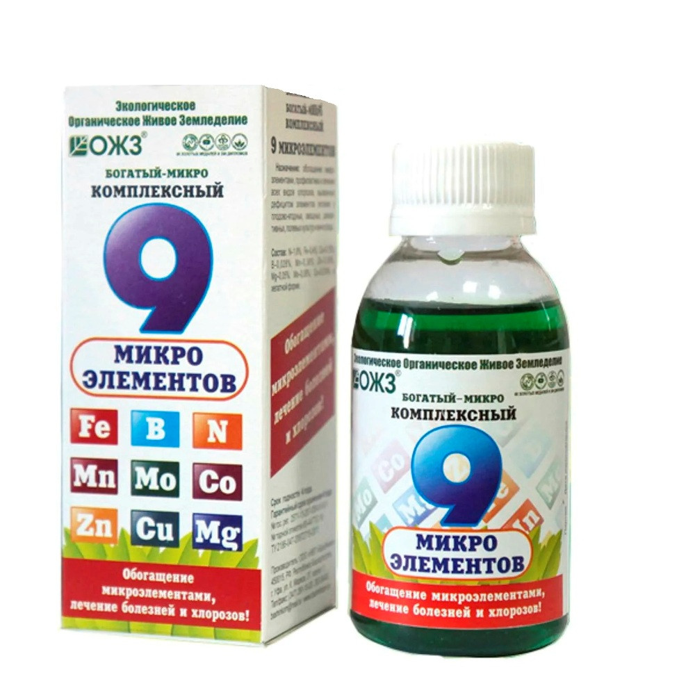 Богатый - микро КОМПЛЕКСНЫЙ (9 микроэлементов) 0,1л., жидкость. Состав: N-1,6%, Fe-0,4%, Cu-0,12%, B-0,028%, Mn-0,36%, Zn-0,09%, Mg-0,05%, Mo-0,08%, Сo-0,016% в хелатной форме. Назначение: обогащение микроэлементами, профилактика и лечение болезней и хлороза, вызванного дефицитом элементов питания у плодовоягодных, овощных, декоративных, полевых культур и винограда. Для профилактики - обработка 1 раз в 2 недели. Для лечения - до полного исчезновения признаков болезни. Способ применения - замачивание семян перед посевом, корневищ, клубней, луковиц перед посадкой на 1-2 часа, обмакивание корневой системы рассады (саженцев), обработка клубней картофеля перед посадкой, опрыскивание растений в период.