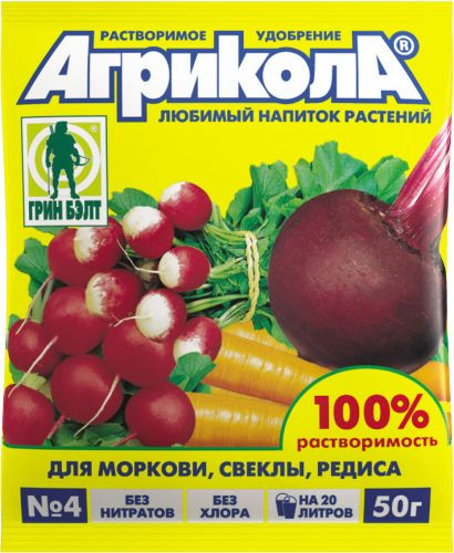 Подкормка корнеплодов удобрением Агрикола 4. Морковь: проводятся 2—3 подкормки. Первая подкормка — через 20—25 суток после появления всходов: 25 г удобрения растворите в 20 л воды и обработайте растения на площади 20—35 кв.м,в зависимости от способа обработки (полив или опрыскивание). Вторая подкормка — через 15—20 суток после 1-ой, третья -через 15 суток после 2!ой. 50 г удобрения растворите в 10 л воды и обработайте 10—25 кв.м посевов в зависимости от способа обработки. Свекла: проводятся 2 подкормки. Первая после прореживания свеклы, вторая — через 15—20 суток в период формирования корнеплода. 25 г удобрений растворите в 10 л воды и обработайте 10—25 кв.м посевов в зависимости от способа обработки.
