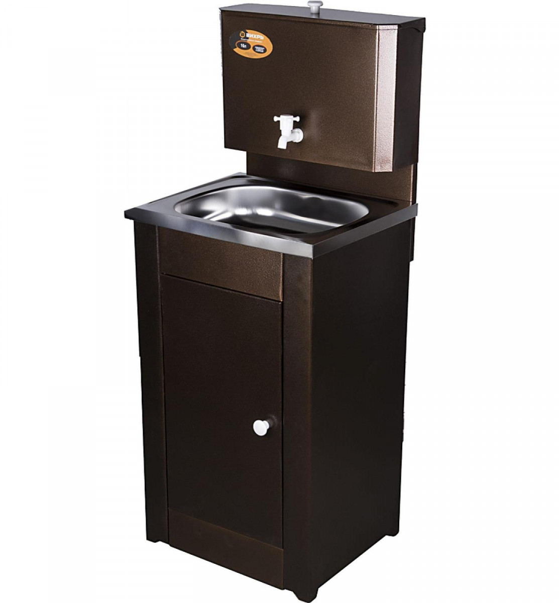 "Умывальник с подогревом, медного цвета, с металлической тумбой и нержавеющей мойкой. Умывальник ВИХРЬ отличается особой функциональностью, так как его можно установить как внутри дома, так и снаружи. Внутри тумбочки ставиться ведро или шланг для слива воды. Так как в таком умывальнике есть раковина, то его можно свободно использовать для мытья посуды.