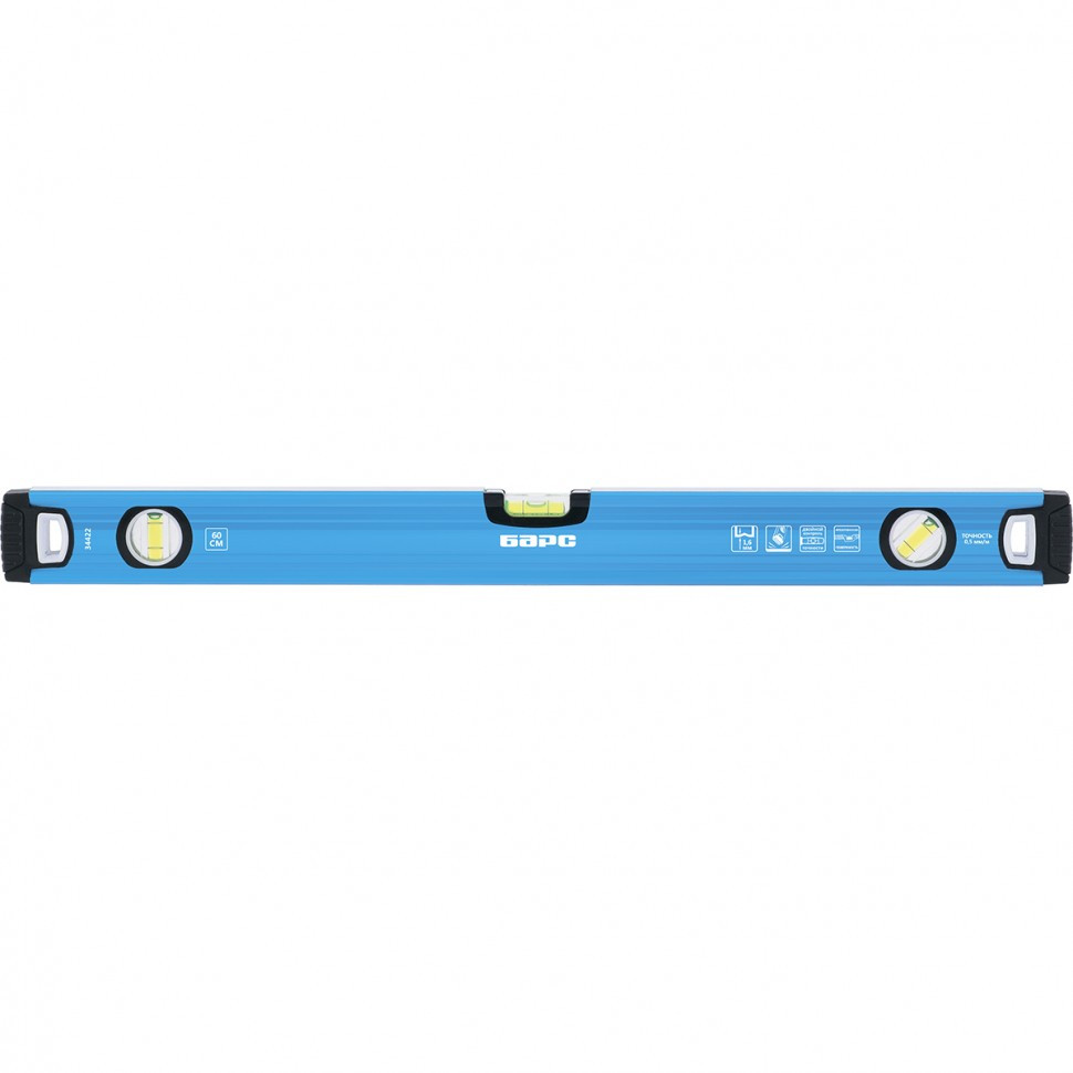 Фрезерованный алюминиевый уровень Барс 34434 длиной 2000 мм, с профилем 1,6 мм и ударопрочными заглушками, оснащен 3 глазками, которые позволяют проверить вертикальные, горизонтальные поверхности и соответствие наклонных поверхностей углу 45 градусов. Инструмент повышает точность строительных и ремонтных работ.ПреимуществаИнструмент изготовлен из легкого и прочного алюминиевого профиля (марка 6063).Высокая точность работы достигается за счет фрезерованной рабочей части и двойного контроля при установке ампул.V-образная форма подошвы обеспечивает возможность фиксации инструмента на трубах при проведении сантехнических работ.Уровень выдерживает падения с небольшой высоты за счет заглушек из износостойкой термопластичной резины (TPR).Строительный уровень удобно хранить на крючке, т.к. в боковых частях имеются отверстия.