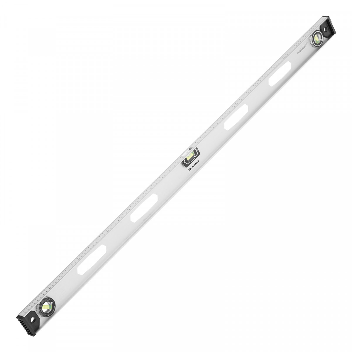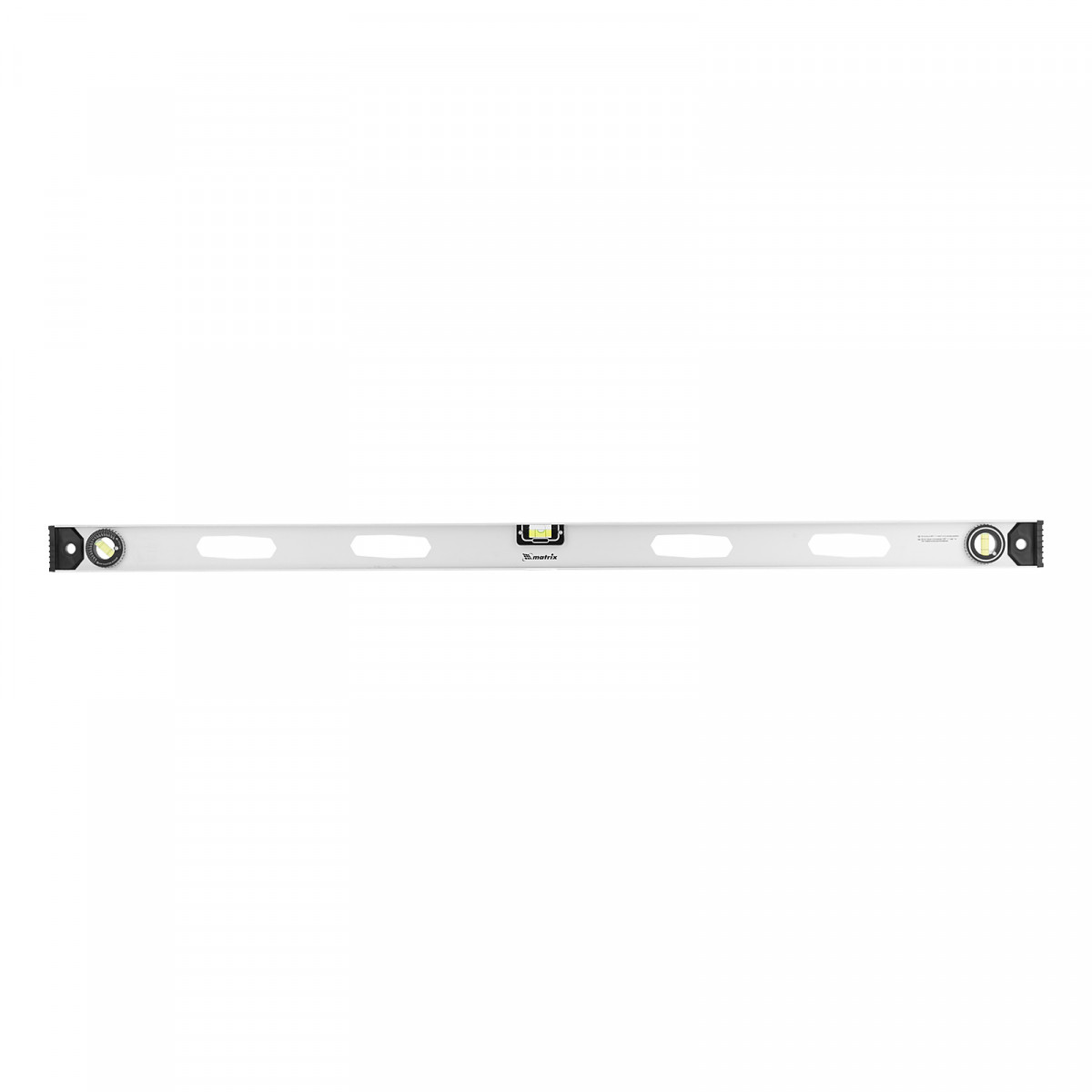 Алюминиевый уровень Matrix «Рельс» 34032 длиной 1200 мм имеет 3 глазка: 2 для проверки отклонений от заданной вертикали и горизонтали и 1 поворотный для проверки наклонных поверхностей.