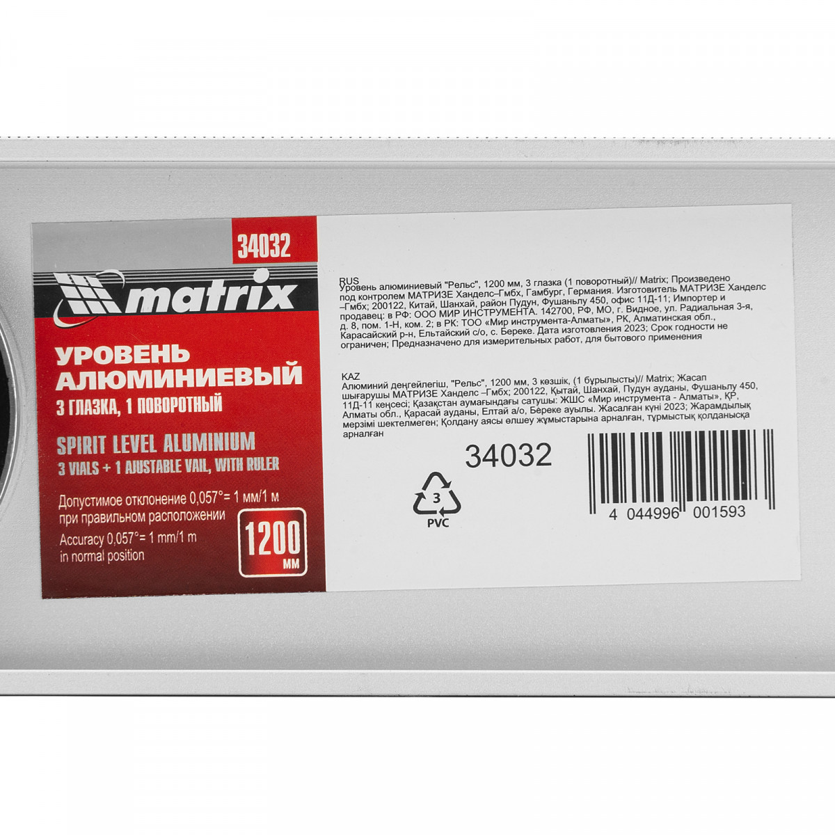 Уровень алюминиевый "Рельс", 1200 мм, 3 глазка (1 поворотный) Matrix