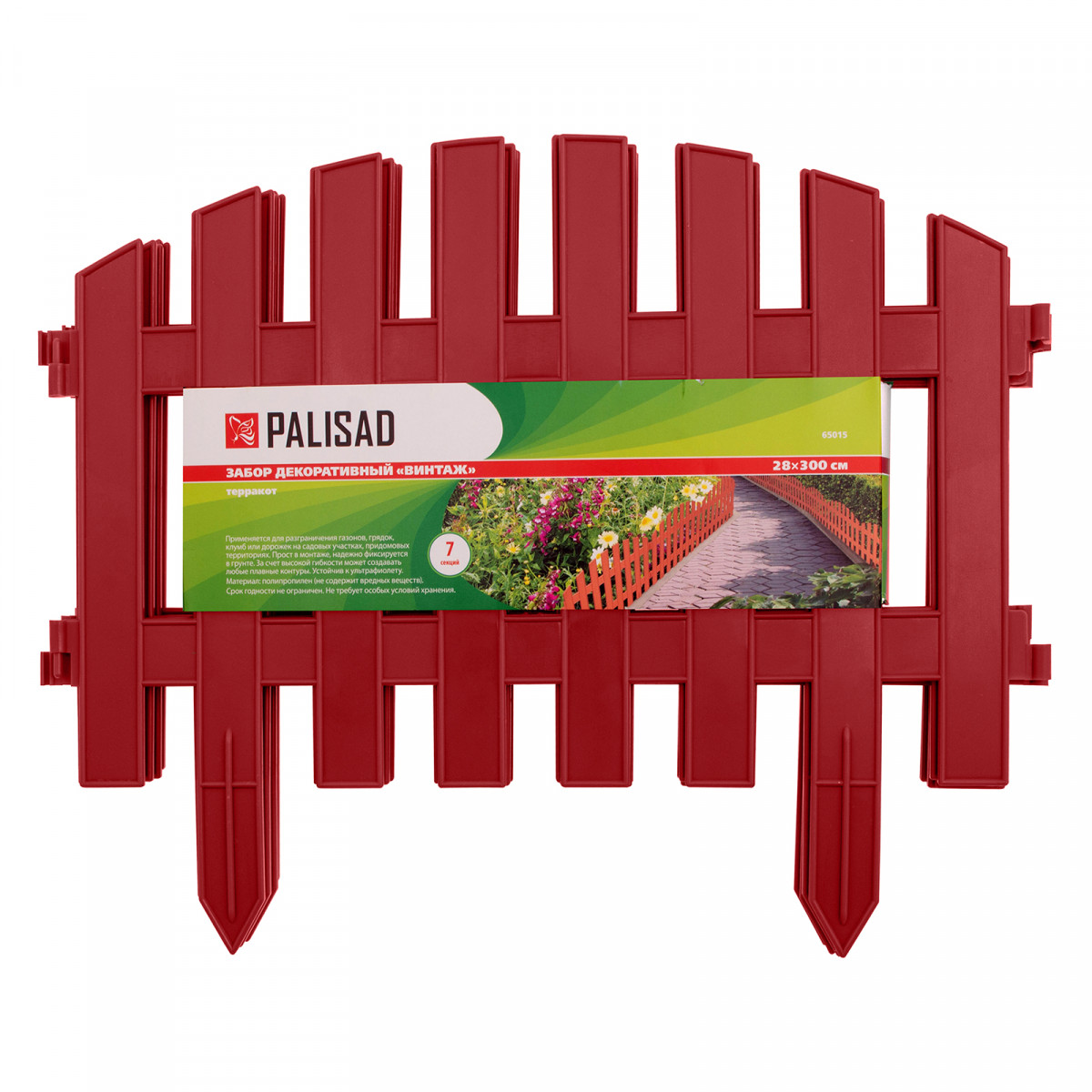 Декоративный забор Palisad «Винтаж» 65015 терракотового цвета, размером 28 х 300 см, предназначен для зонирования территории. Состоит из 7 оригинальных секций общей длиной 300 см. С их помощью можно оформить клумбу, дорожку или зону отдыха, огородить грядки, деревья или кусты. Забор придаст законченный вид территории дачного участка.